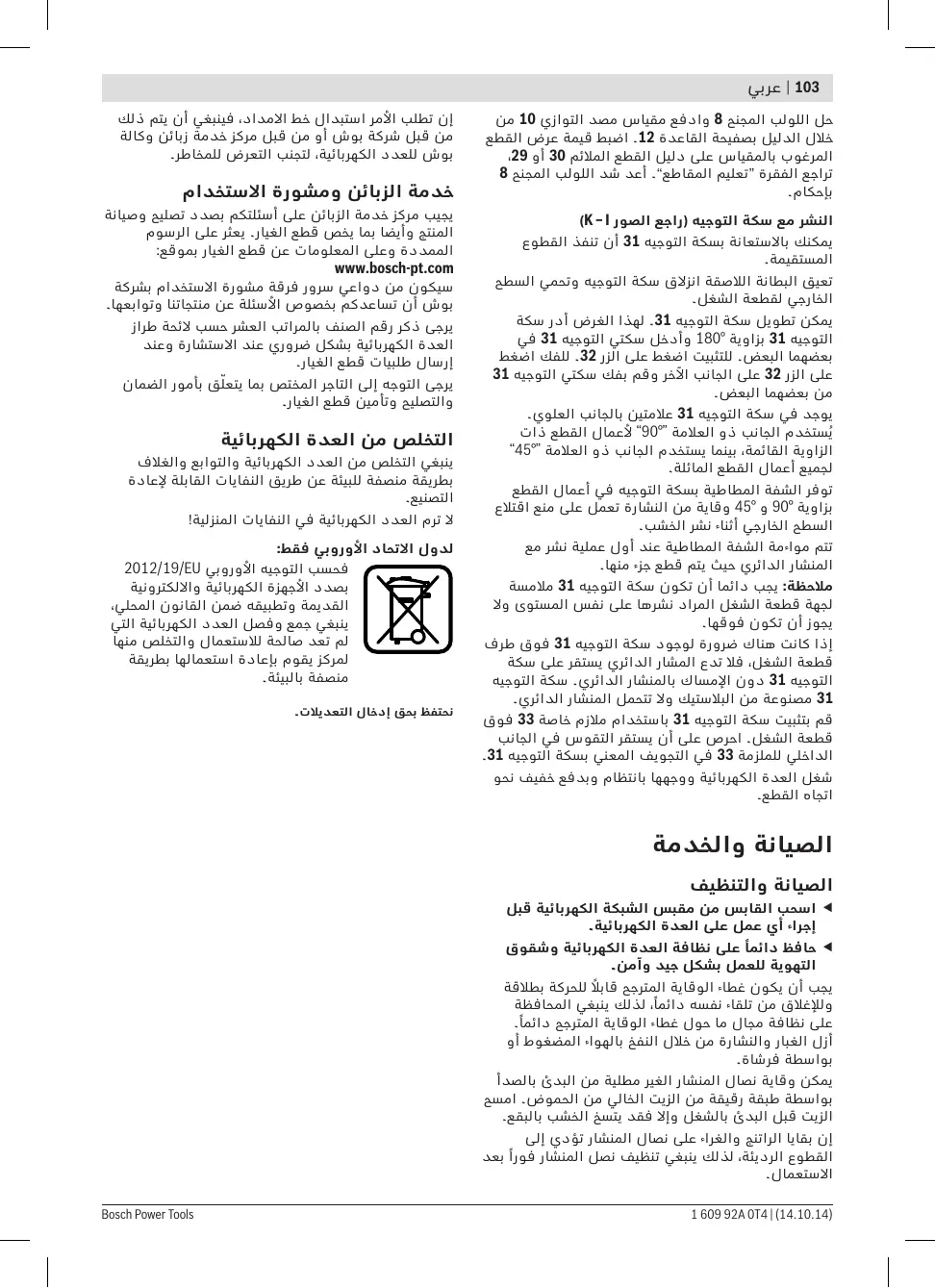 إن تطلب األمر استبدال خط االمداد ،فينبغي أن يتم ذلك من قبل شركة بوش أو من قبل مركز خدمة زبائن وكالة بوش للعدد الكهربائية ،لتجنب التعرض للمخاطر. خدمة الزبائن ومشورة االستخدام النشر مع سكة التوجيه (راجع الصور )K – I يمكنك باالستعانة بسكة التوجيه 31أن تنفذ القطوع