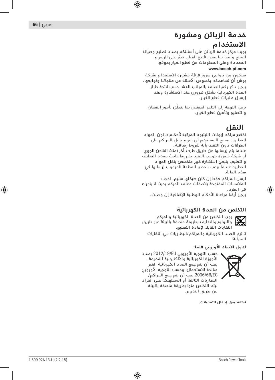 تخضع مراكم إيونات الليثيوم المركبة ألحكام قانون المواد الخطيرة .يسمح للمستخدم أن يقوم بنقل المراكم علی الطرقات دون التقيد بأية شروط إضافية. عندما يتم إرسالها عن طريق طرف آخر (مثال :الشحن الجوي أو شركة شحن) ،يتوجب التقيد بشروط خاصة بصدد التغليف والتعليم .ينبغي استشارة خبير متخصص بنقل المواد الخطيرة عندما يرغب بتحضير القطعة المرغوب إرسالها في هذه الحالة. ارسل المراكم فقط إن كان هيكلها سليم .احجب المالمسات المفتوحة بالصقات وغلف المركم بحيث ال يتحرك يرجی أيضا مراعاة األحكام الوطنية اإلضافية إن وجدت. التخلص من العدة الكهربائية يجب التخلص من العدة الكهربائية والمركم والتوابع والتغليف بطريقة منصفة بالبيئة عن طريق النفايات القابلة إلعادة التصنيع. ال ترم العدد الكهربائية والمراكم/البطاريات في النفايات لدول االتحاد األوروبي فقط: حسب التوجيه األوروبي 2012/19/EUبصدد األجهزة الكهربائية وااللكترونية القديمة، يجب أن يتم جمع العدد الكهربائية الغير صالحة لالستعمال ،وحسب التوجيه األوروبي 2006/66/ECيجب أن يتم جمع المراكم/ البطاريات التالفة أو المستهلكة علی انفراد ليتم التخلص منها بطريقة منصفة بالبيئة عن طريق التدوير. نحتفظ بحق إدخال التعديالت. Bosch Power Tools )1 609 92A 13U | (2.2.15 | 67يبرع