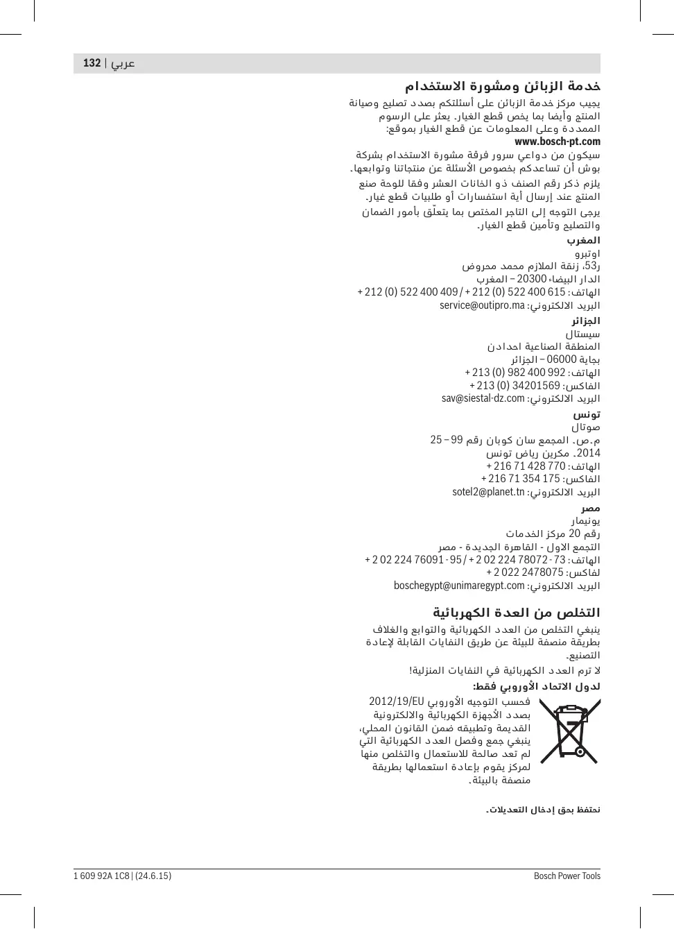 رقم 20مركز الخدمات التجمع االول -القاهرة الجديدة -مصر الهاتف+ 2 02 224 76091 - 95 / + 2 02 224 78072 - 73 : لفاكس+ 2 022 2478075 : البريد االلكترونيboschegypt@unimaregypt.com : التخلص من العدة الكهربائية ينبغي التخلص من العدد الكهربائية والتوابع والغالف بطريقة منصفة للبيئة عن طريق النفايات القابلة إلعادة ال ترم العدد الكهربائية في النفايات المنزلية! لدول االتحاد األوروبي فقط: فحسب التوجيه األوروبي 2012/19/EU بصدد األجهزة الكهربائية وااللكترونية القديمة وتطبيقه ضمن القانون المحلي، ينبغي جمع وفصل العدد الكهربائية التي لم تعد صالحة لالستعمال والتخلص منها لمركز يقوم بإعادة استعمالها بطريقة منصفة بالبيئة. نحتفظ بحق إدخال التعديالت. Bosch Power Tools )1 609 92A 1C8 | (24.6.15 | 133يبرع مالحظات شغل ◀ ◀احترس عند الشطب بالجدران الحاملة :تراجع فقرة “المالحظات بصدد االستاتيك”. شد قطعة الشغل بملزمة إن لم تثبت بأمان من جراء