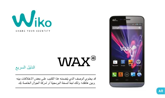 ال تعد ضمانا ً بأيّ شكل من األشكال. لقد اشتريت تواً هاتفك الجوال . WIKO WAX في هذا الدليل ،سوف تجد جميع المعلومات المتعلقة باستخدام هذا الهاتف المحمول؛ والتي نتمنى أن تساعدك على التعرُّ ف على عالم WIKO