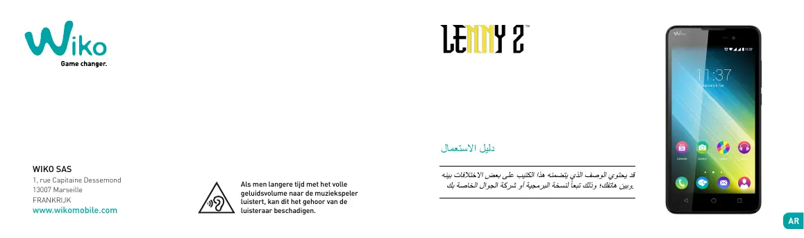 لقد اشتريت تواً هاتفك الجوال .WIKO LENNY2 في هذا الدليل ،سوف تجد جميع المعلومات المتعلقة باستخدام هذا الهاتف المحمول؛ والتي نتمنى أن تساعدك على التعرُّ ف على عالم WIKO حقوق التأليف © WIKO 2015 إن المعلومات الواردة في هذا الدليل قد ال يتم الكشف عنها إلى أطراف ثالثة أو تستنسخ بأي شكل من األشكال دون موافقة كتابية صريحة من .wiko العالمات التجارية