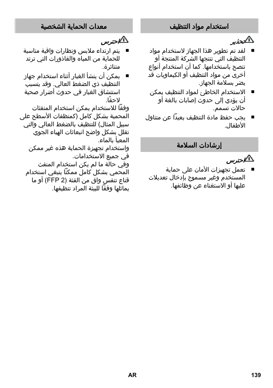 Si l'utilisation d'une buse inté- gralement blindée s'avère im- possible, utiliser alors un masque respiratoire de la classe FFP 2 ou un masque comparable, en fonction de l'environnement à nettoyer.