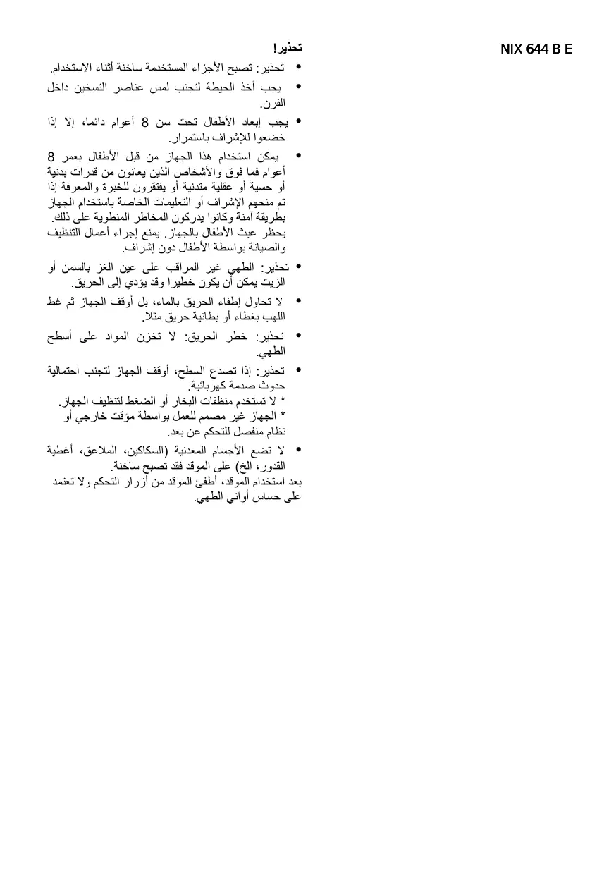تحذٌر! • تحذٌر :تصبح األجزاء المستخدمة ساخنة أثناء االستخدام. • ٌجب أخذ الحٌطة لتجنب لمس عناصر التسخٌن داخل الفرن. • ٌجب إبعاد األطفال تحت سن 8أعوام دائما ،إال إذا خضعوا لإلشراؾ باستمرار. • ٌمكن استخدام هذا الجهاز من قبل األطفال بعمر 8 أعوام فما فوق واألشخاص الذٌن ٌعانون من قدرات بدنٌة أو حسٌة أو عقلٌة متدنٌة أو ٌفتقرون للخبرة والمعرفة إذا تم منحهم اإلشراؾ أو التعلٌمات الخاصة باستخدام الجهاز بطرٌقة آمنة وكانوا ٌدركون المخاطر المنطوٌة على ذلك. ٌحظر عبث األطفال بالجهازٌ .منع إجراء أعمال التنظٌؾ والصٌانة بواسطة األطفال دون إشراؾ. • تحذٌر :الطهً ؼٌر المراقب على عٌن الؽز بالسمن أو الزٌت ٌمكن أن ٌكون خطٌرا وقد ٌؤدي إلى الحرٌق. • ال تحاول إطفاء الحرٌق بالماء ،بل أوقؾ الجهاز ثم ؼط اللهب بؽطاء أو بطانٌة حرٌق مثال. • تحذٌر :خطر الحرٌق :ال تخزن المواد على أسطح الطهً. • تحذٌر :إذا تصدع السطح ،أوقؾ الجهاز لتجنب احتمالٌة حدوث صدمة كهربائٌة. * ال تستخدم منظفات البخار أو الضؽط لتنظٌؾ الجهاز. * الجهاز ؼٌر مصمم للعمل بواسطة مؤقت خارجً أو نظام منفصل للتحكم عن بعد. • ال تضع األجسام المعدنٌة (السكاكٌن ،المالعق ،أؼطٌة القدور ،الخ) على الموقد فقد تصبح ساخنة. بعد استخدام الموقد ،أطفئ الموقد من أزرار التحكم وال تعتمد على حساس أوانً الطهً.