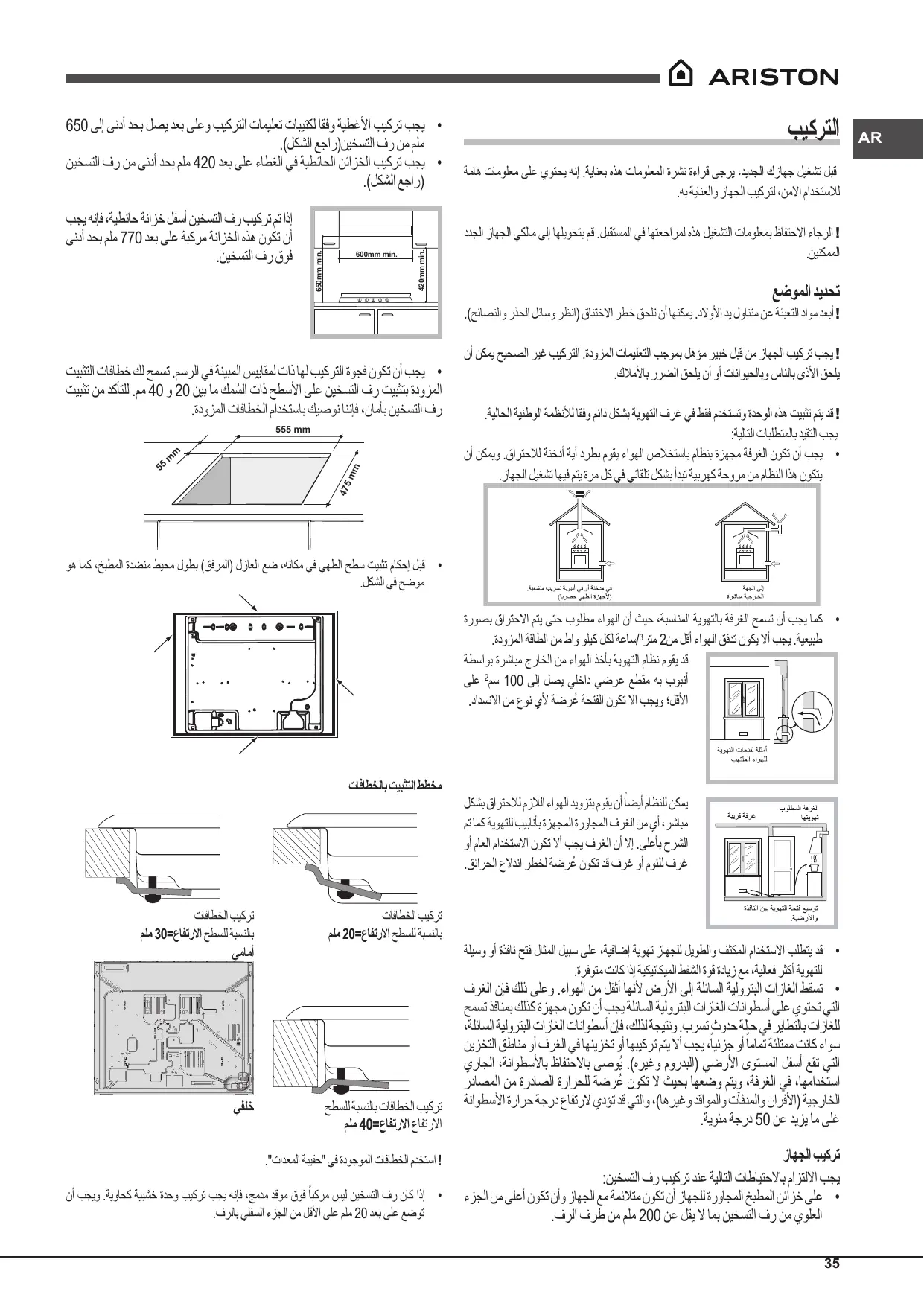 - يجب تركيب الخزائن الحائطية في الغطاء على بعد 420ملم بحد أدنى من رف التسخين (راجع الشكل). إذا تم تركيب رف التسخين أسفل خزانة حائطية ،فإنه يجب أن تكون هذه الخزانة مركبة على بعد 770ملم بحد أدنى فوق رف التسخين. ! أبعد مواد التعبئة عن متناول يد األوالد .يمكنها أن تلحق خطر االختناق (انظر وسائل الحذر والنصائح). ! يجب تركيب الجهاز من قبل خبير مؤهل بموجب التعليمات المزودة .التركيب غير الصحيح يمكن أن يلحق األذى بالناس وبالحيوانات أو أن يلحق الضرر باألمالك. 555 mm