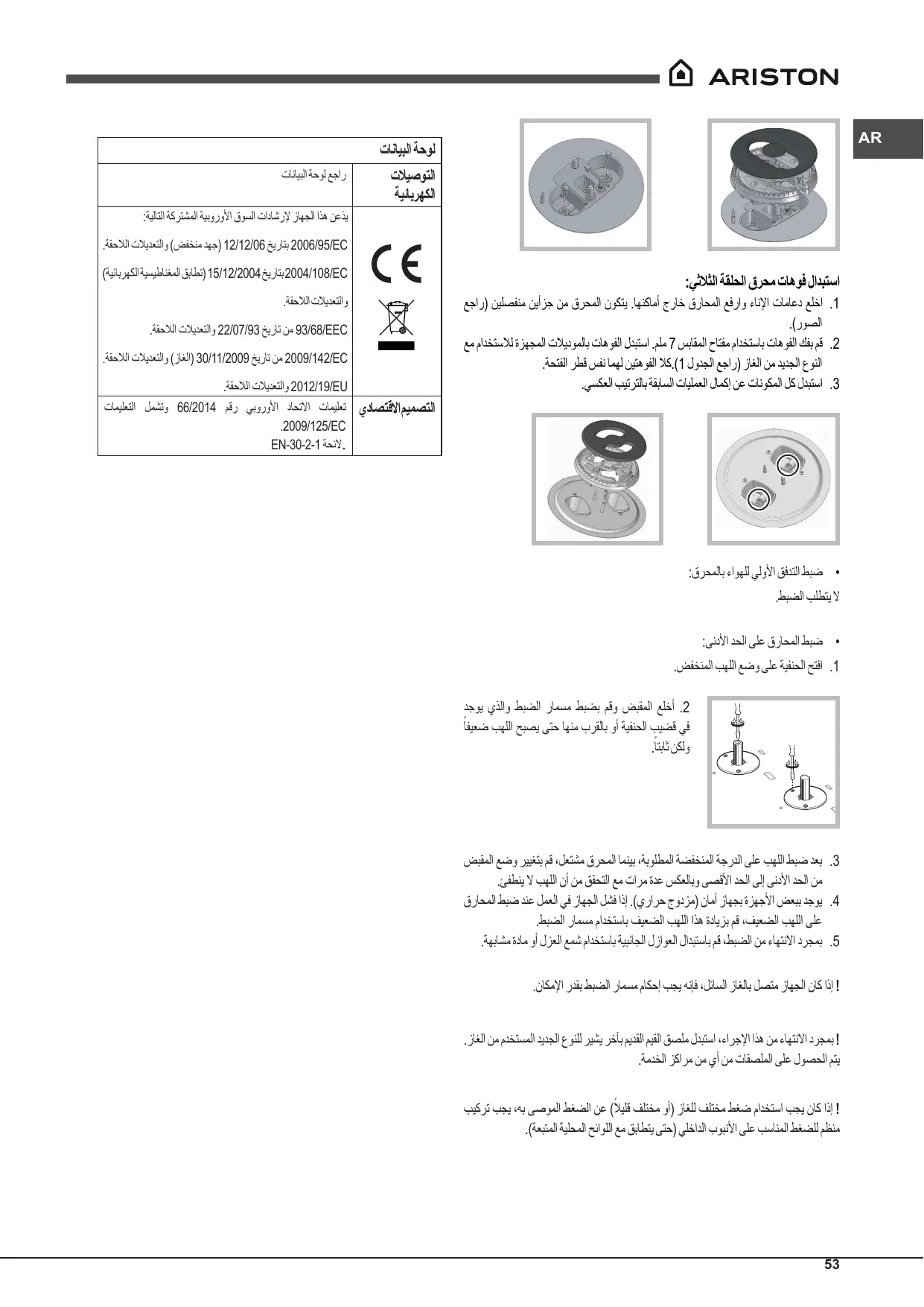 .3بعد ضبط اللهب على الدرجة المنخفضة المطلوبة ،بينما المحرق مشتعل ،قم بتغيير وضع المقبض من الحد األدنى إلى الحد األقصى وبالعكس عدة مرات مع التحقق من أن اللهب ال ينطفئ. .4يوجد ببعض األجهزة بجهاز أمان (مزدوج حراري) .إذا فشل الجهاز في العمل عند ضبط المحارق على اللهب الضعيف ،قم بزيادة هذا اللهب الضعيف باستخدام مسمار الضبط. .5بمجرد االنتهاء من الضبط ،قم باستبدال العوازل الجانبية باستخدام شمع العزل أو مادة مشابهة. ! إذا كان الجهاز متصل بالغاز السائل ،فإنه يجب إحكام مسمار الضبط بقدر اإلمكان. ! بمجرد االنتهاء من هذا اإلجراء ،استبدل ملصق القيم القديم بآخر يشير للنوع الجديد المستخدم من الغاز. يتم الحصول على الملصقات من أي من مراكز الخدمة. ! إذا كان يجب استخدام ضغط مختلف للغاز (أو مختلف ً قليال) عن الضغط الموصى به ،يجب تركيب منظم للضغط المناسب على األنبوب الداخلي (حتى يتطابق مع اللوائح المحلية المتبعة).