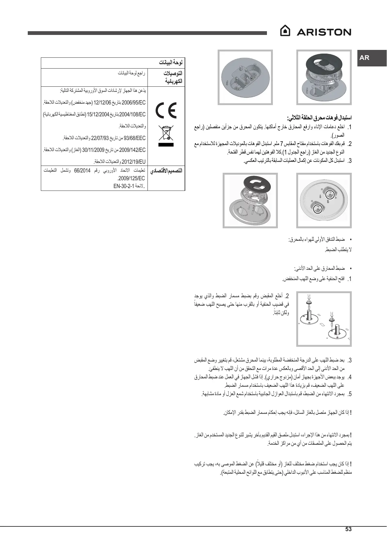 .3بعد ضبط اللهب على الدرجة المنخفضة المطلوبة ،بينما المحرق مشتعل ،قم بتغيير وضع المقبض من الحد األدنى إلى الحد األقصى وبالعكس عدة مرات مع التحقق من أن اللهب ال ينطفئ. .4يوجد ببعض األجهزة بجهاز أمان (مزدوج حراري) .إذا فشل الجهاز في العمل عند ضبط المحارق على اللهب الضعيف ،قم بزيادة هذا اللهب الضعيف باستخدام مسمار الضبط. .5بمجرد االنتهاء من الضبط ،قم باستبدال العوازل الجانبية باستخدام شمع العزل أو مادة مشابهة. ! إذا كان الجهاز متصل بالغاز السائل ،فإنه يجب إحكام مسمار الضبط بقدر اإلمكان. ! بمجرد االنتهاء من هذا اإلجراء ،استبدل ملصق القيم القديم بآخر يشير للنوع الجديد المستخدم من الغاز. يتم الحصول على الملصقات من أي من مراكز الخدمة. ! إذا كان يجب استخدام ضغط مختلف للغاز (أو مختلف ً قليال) عن الضغط الموصى به ،يجب تركيب منظم للضغط المناسب على األنبوب الداخلي (حتى يتطابق مع اللوائح المحلية المتبعة).