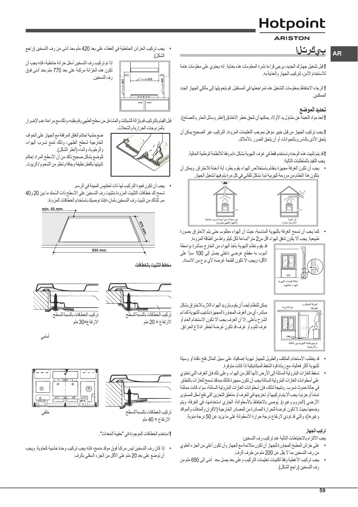 - يجب أن تكون فجوة التركيب لها ذات لمقاييس المبينة في الرسم. السمك ما بين 20و40 تسمح لك خطافات التثبيت المزودة بتثبيت رف التسخين على األسطح ذات ُ مم .للتأكد من تثبيت رف التسخين بأمان ،فإننا نوصيك باستخدام الخطافات المزودة. min. 55 mm. يمكن للنظام أيضاً أن يقوم بتزويد الهواء الالزم لالحتراق بشكل مباشر ،أي من الغرف المجاورة المجهزة بأنابيب للتهوية كما تم الشرح بأعلى .إال أن الغرف يجب أال تكون االستخدام العام أو غرف للنوم أو غرف قد تكون ُعرضة لخطر اندالع الحرائق.