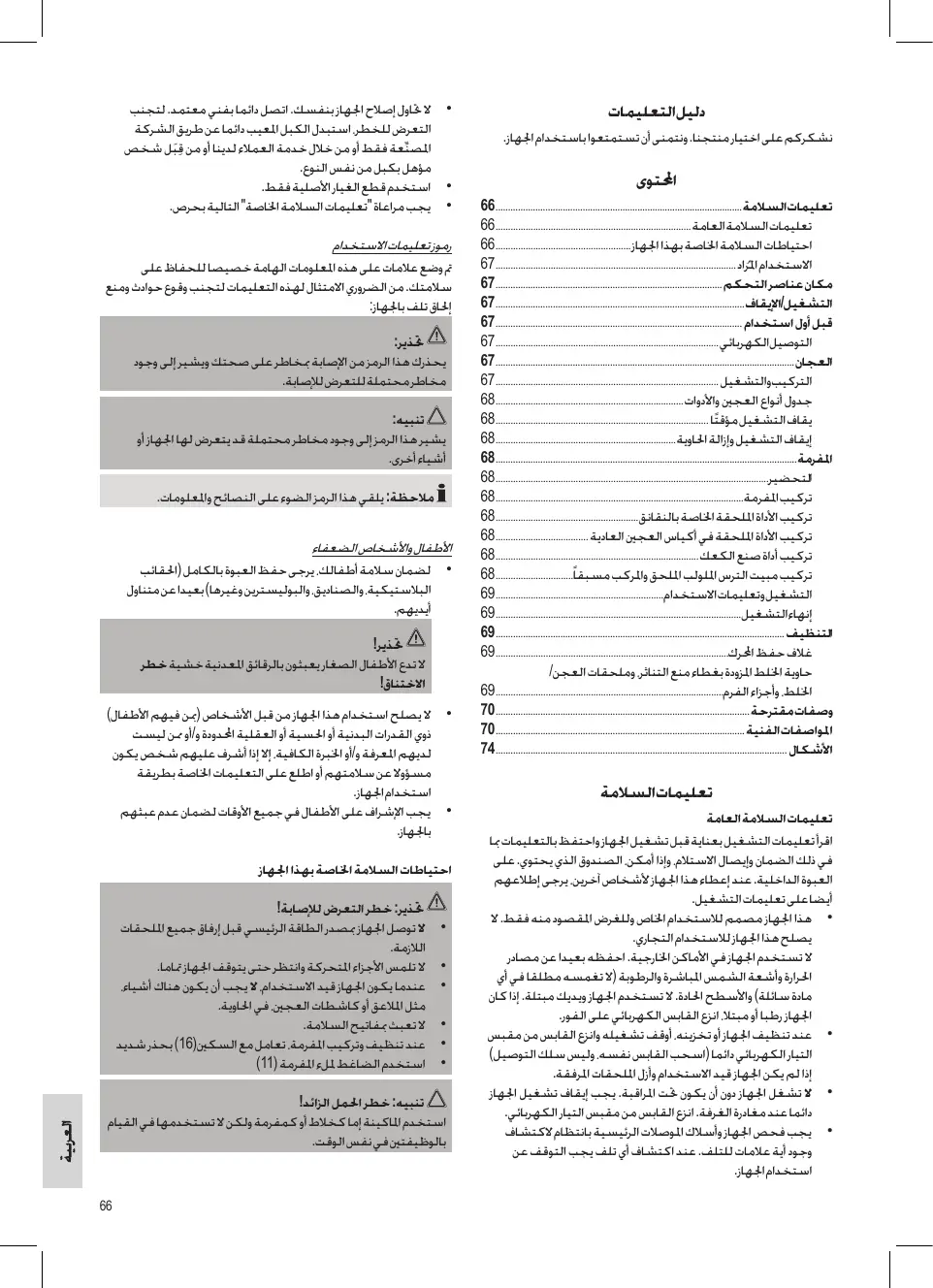 تعليماتالسالمة66.................................................................................................... تعليمات السالمة العامة66............................................................................... احتياطات السالمة اخلاصة بهذا اجلهاز66....................................................... االستخدام املُراد67................................................................................................. مكان عناصر التحكم67............................................................................................ التشغيل/اإليقاف67..................................................................................................... قبل أول استخدام 67.................................................................................................... التوصيلالكهربائي67.......................................................................................... العجان67......................................................................................................................... التركيبوالتشغيل67.......................................................................................... جدول أنواع العجني واألدوات68............................................................................ يقاف التشغيل مؤق ًتا68...................................................................................... إيقاف التشغيل وإزالة احلاوية68......................................................................... املفرمة68.......................................................................................................................... التحضير68.............................................................................................................. تركيب املفرمة68.................................................................................................... تركيب األداة امللحقة اخلاصة بالنقانق68.......................................................... تركيب األداة امللحقة في أكياس العجني العادية68...................................... تركيب أداة صنع الكعك68.................................................................................. تركيب مبيت الترس امللولب امللحق واملركب مسبقاً68................................ التشغيل وتعليمات االستخدام69.................................................................... إنهاءالتشغيل69................................................................................................... التنظيف69..................................................................................................................... غالف حفظ احملرك69.............................................................................................. حاوية اخللط املزودة بغطاء منع التناثر ،وملحقات العجن/ اخللط ،وأجزاء الفرم69............................................................................................ وصفات مقترحة70....................................................................................................... املواصفاتالفنية70..................................................................................................... األشكال 74...................................................................................................................... تعليماتالسالمة تعليمات السالمة العامة اقرأ تعليمات التشغيل بعناية قبل تشغيل اجلهاز واحتفظ بالتعليمات مبا في ذلك الضمان وإيصال االستالم ،وإذا أمكن ،الصندوق الذي يحتوي .على العبوة الداخلية .عند إعطاء هذا اجلهاز ألشخاص آخرين ،يرجى إطالعهم أيضا على تعليمات التشغيل.