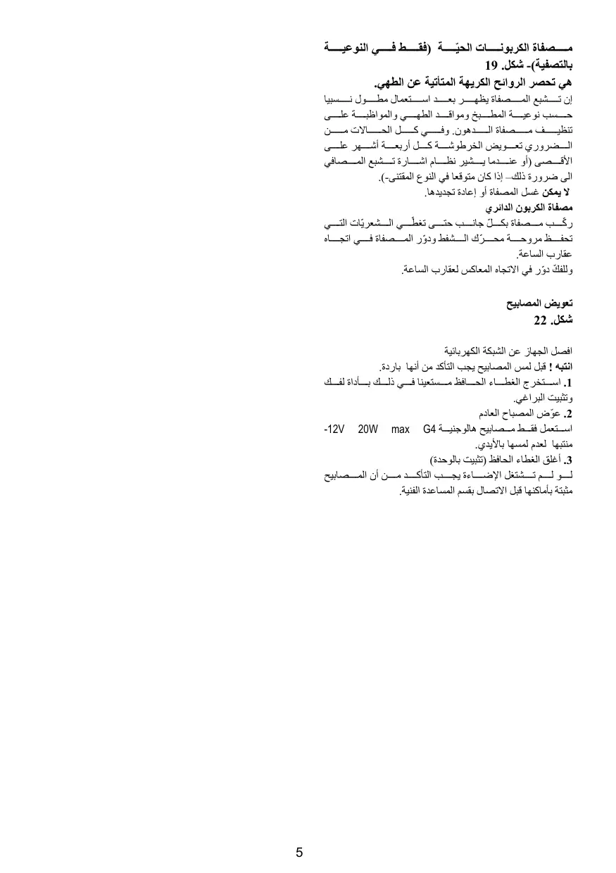 م صفاة الكربون ات الحيّ ة )فق ط ف ي النوعي ة بالتصفية( -شكل19 . ھي تحصر الروائح الكريھة المتأتية عن الطھي. إن ت شبع الم صفاة يظھ ر بع د اس تعمال مط ول ن سبيا ح سب نوعي ة المط بخ ومواق د الطھ ي والمواظب ة عل ى تنظي ف م صفاة ال دھون .وف ي ك ل الح االت م ن ال ضروري تع ويض الخرطوش ة ك ل أربع ة أش ھر عل ى األق صى )أو عن دما ي شير نظ ام اش ارة ت شبع الم صافي الى ضرورة ذلك– إذا كان متوقعا في النوع المقتنى.(- ال يمكن غسل المصفاة أو إعادة تجديدھا. مصفاة الكربون الدائري ر ّك ب م صفاة بك ّل جان ب حت ى تغطّ ي ال شعريّات الت ي تحف ظ مروح ة مح رّك ال شفط ودوّر الم صفاة ف ي اتج اه عقارب الساعة. ك دوّر في االتجاه المعاكس لعقارب الساعة. تعويض المصابيح شكل22 . افصل الجھاز عن الشبكة الكھربائية انتبه ! قبل لمس المصابيح يجب التأكد من أنھا باردة. .1اس تخرج الغط اء الح افظ م ستعينا ف ي ذل ك ب أداة لف ك وتثبيت البراغي. .2عوّض المصباح العادم اس تعمل فق ط م صابيح ھالوجني ة -12V 20W max G4 منتبھا لعدم لمسھا باأليدي. .3أغلق الغطاء الحافظ )تثبيت بالوحدة( ل و ل م ت شتغل اإلض اءة يج ب التأك د م ن أن الم صابيح مثبتة بأماكنھا قبل االتصال بقسم المساعدة الفنية.