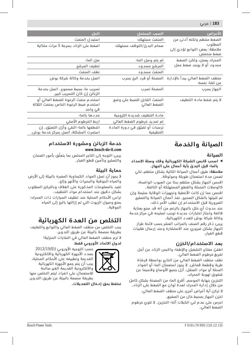 التخلص من العدة الكهربائية يجب التخلص من منظف الضغط العالي والتوابع والتغليف بطريقة منصفة بالبيئة عن طريق التدوير. ال ترم منظف الضغط العالي في النفايات المنزلية! لدول االتحاد األوروبي فقط: حسب التوجيه األوروبي 2012/19/EU بصدد األجهزة الكهربائية وااللكترونية القديمة وتطبيقه علی األحكام المحلية، يجب أن يتم جمع األجهزة الكهربائية وااللكترونية القديمة الغير صالحة لالستعمال علی انفراد ليتم التخلص منها بطريقة منصفة بالبيئة عن طريق التدوير. نحتفظ بحق إدخال التعديالت. ال تركن أية أغراض أخری علی منظف الضغط العالي. اخزن الجهاز بمحيط خال من الصقيع. احرص علی عدم ثني الكبالت أثناء التخزين .ال تلوي خرطوم الضغط العالي. )F 016 L70 995 | (16.12.13 Bosch Power Tools يبرع | 184 ال تستخدم المنفث الدوار لغسل السيارة. تحذير! تصلح الباتسيو كلينرز لالستخدام على السطوح األفقية فقط! ال تستخدمها على الدرج أو السطوح العامودية .ال تلمس المنفث الدوار أبدا عندما يعمل! مالحظات عمل من أجل العمل مع المواد ◀ ◀استخدم فقط المواد التنظيفية المخصصة بشكل صريح ألجهزة التنظيف بالضغط العالي. إننا ننصح باستخدام المواد التنظيفية بطريقة اقتصادية حفاظا علی البيئة .تراعی نصائح التخفيف المدونة علی