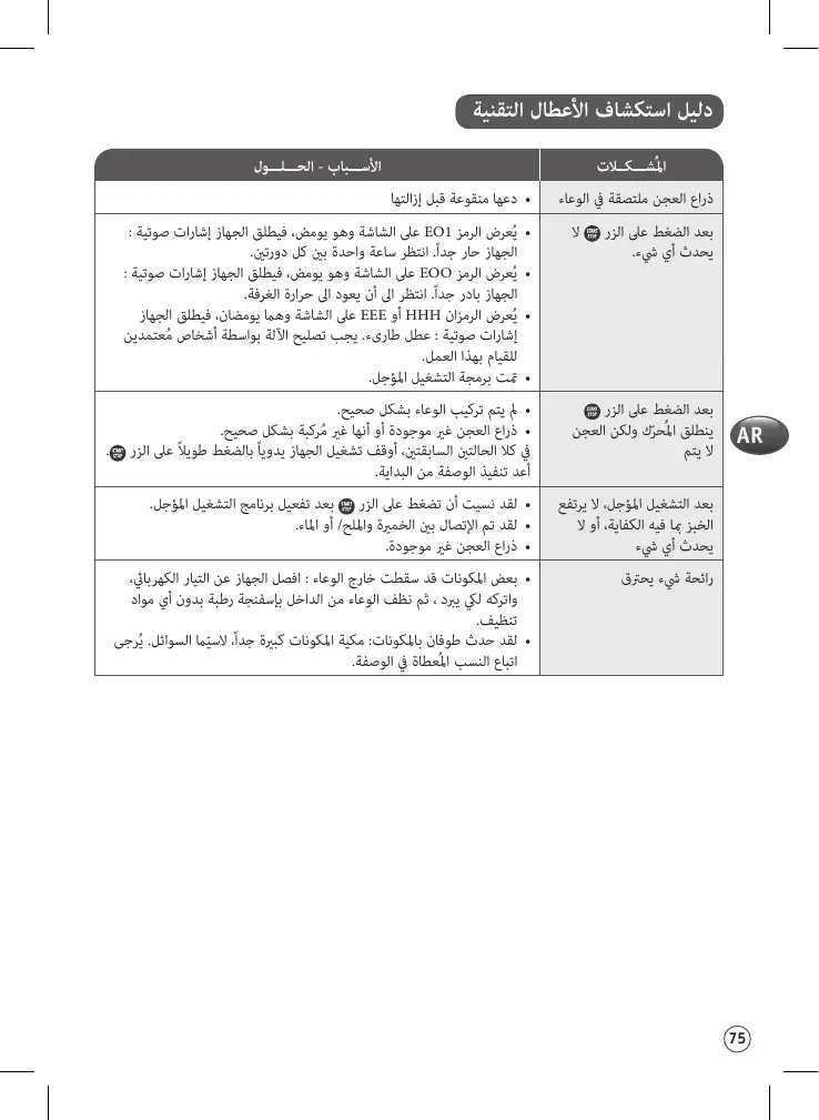 تم الضغط عىل الزر أثناء عملية ال َخبْز كمية الطحني غري كافية كمية الطحني كثرية الخمرية غري كافية الخمرية زائدة كمية املاء غري كافية كمية املاء زائدة السكر غري ٍ كاف كمية الطحني قليلة مقادير املكونات غري صحيحة (زائدة) املاء ساخن جدا ً املاء بارد جدا ً خطأ يف اختيار الربنامج هل فشلت يف الحصول عىل النتيجة املرجوة؟ يُساعدك هذا املخطط يف تحديد الحل.