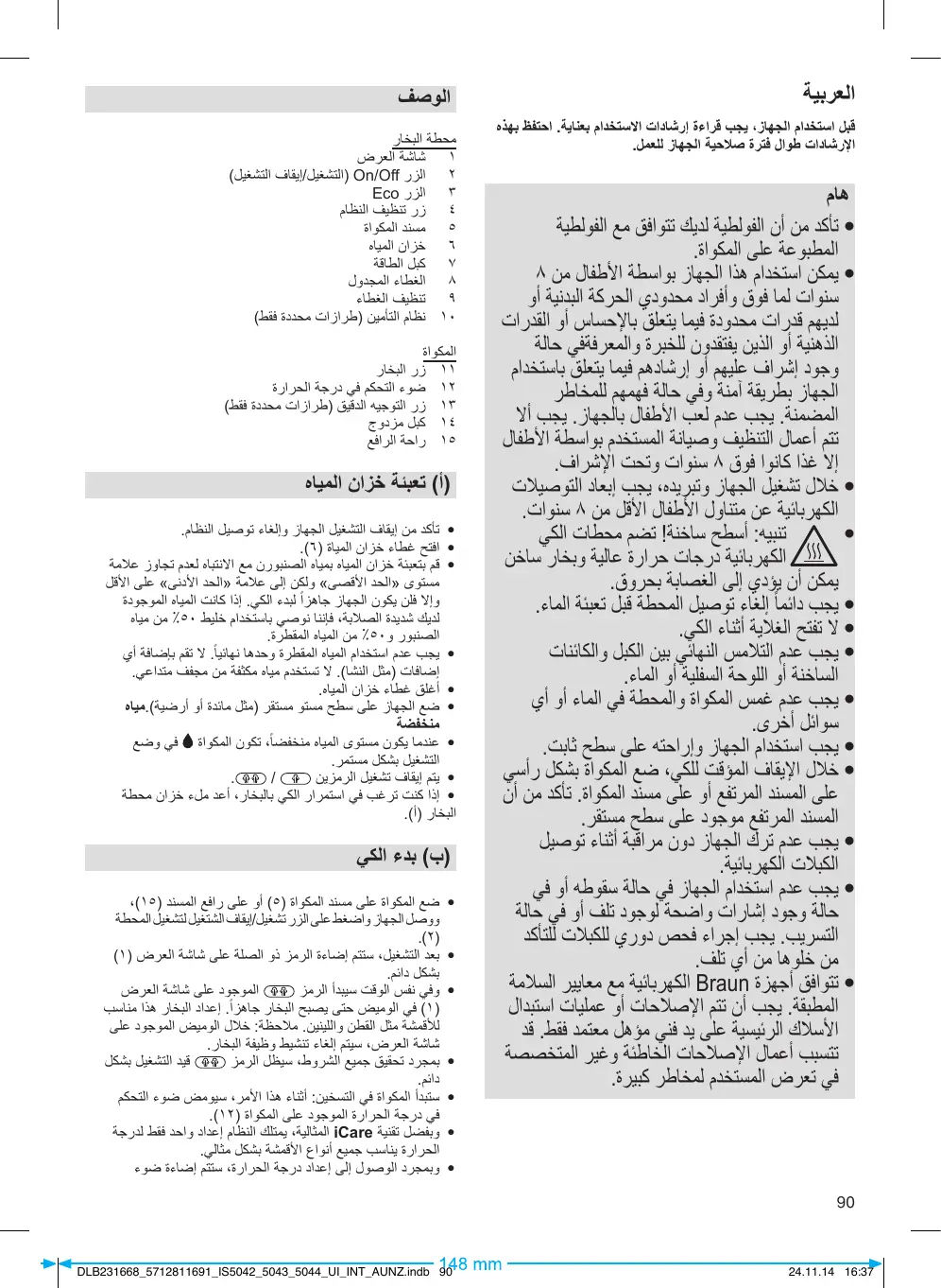 تأكد من أن الفولطية لديك تتوافق مع الفولطية المطبوعة على المكواة. يمكن استخدام هذا الجهاز بواسطة األطفال من 8 سنوات لما فوق وأفراد محدودي الحركة البدنية أو لديهم قدرات محدودة فيما يتعلق باإلحساس أو القدرات الذهنية أو الذين يفتقدون للخبرة والمعرفةفي حالة وجود إشراف عليهم أو إرشادهم فيما يتعلق باستخدام الجهاز بطريقة آمنة وفي حالة فهمهم للمخاطر المضمنة .يجب عدم لعب األطفال بالجهاز .يجب أال تتم أعمال التنظيف وصيانة المستخدم بواسطة األطفال إال غذا كانوا فوق 8سنوات وتحت اإلشراف. خالل تشغيل الجهاز وتبريده ،يجب إبعاد التوصيالت الكهربائية عن متناول األطفال األقل من 8سنوات. تنبيه :أسطح ساخنة! تضم محطات الكي الكهربائية درجات حرارة عالية وبخار ساخن يمكن أن يؤدي إلى الغصابة بحروق. يجب دائما ً إلغاء توصيل المحطة قبل تعبئة الماء. ال تفتح الغالية أثناء الكي. يجب عدم التالمس النهائي بين الكبل والكائنات الساخنة أو اللوحة السفلية أو الماء. يجب عدم غمس المكواة والمحطة في الماء أو أي سوائل أخرى. يجب استخدام الجهاز وإراحته على سطح ثابت. خالل اإليقاف المؤقت للكي ،ضع المكواة بشكل رأسي على المسند المرتفع أو على مسند المكواة .تأكد من أن المسند المرتفع موجود على سطح مستقر. يجب عدم ترك الجهاز دون مراقبة أثناء توصيل الكبالت الكهربائية. يجب عدم استخدام الجهاز في حالة سقوطه أو في حالة وجود إشارات واضحة لوجود تلف أو في حالة التسريب .يجب إجراء فحص دوري للكبالت للتأكد من خلوها من أي تلف. تتوافق أجهزة Braunالكهربائية مع معايير السالمة المطبقة .يجب أن تتم اإلصالحات أو عمليات استبدال األسالك الرئيسية على يد فني مؤهل معتمد فقط .قد تتسبب أعمال اإلصالحات الخاطئة وغير المتخصصة في تعرض المستخدم لمخاطر كبيرة.