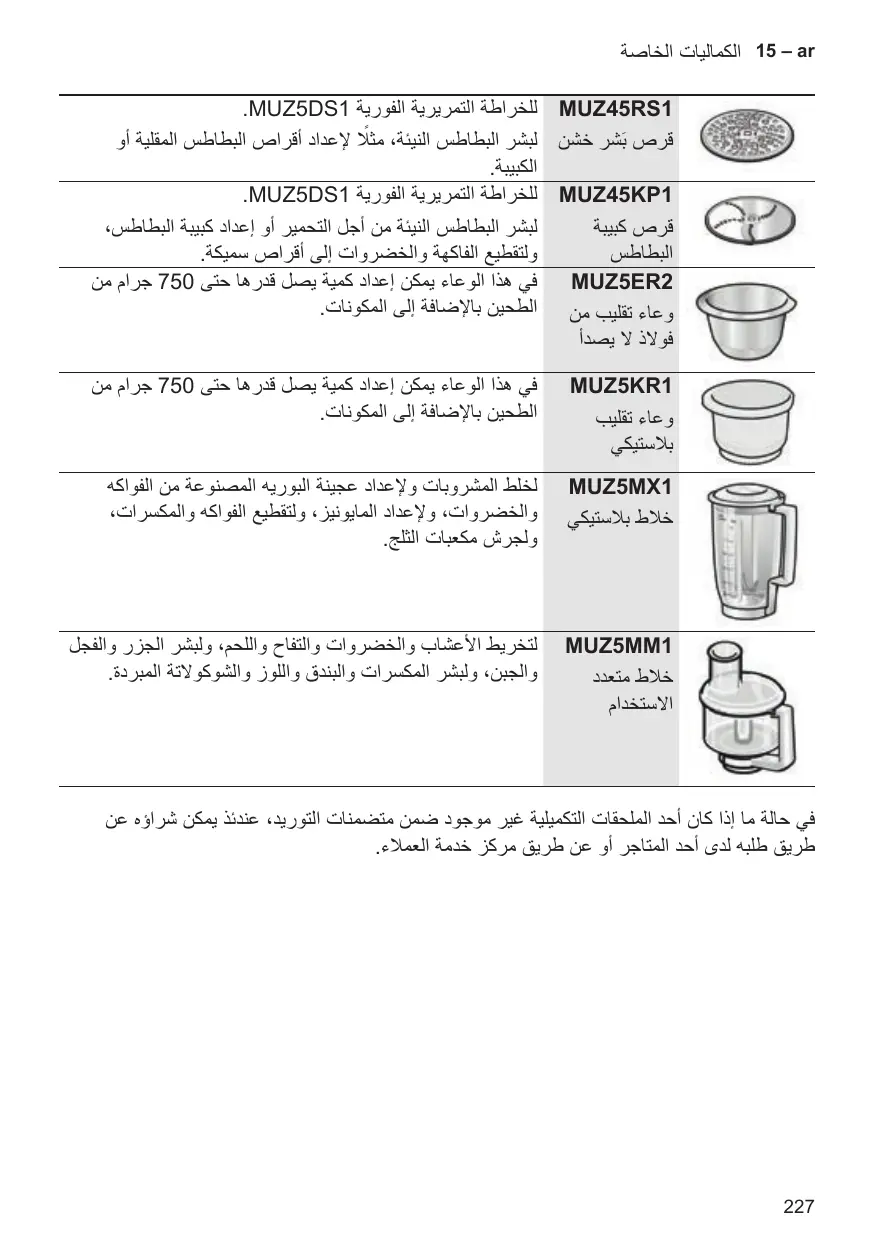 15 – arالﻛﻣاليات الخاﺻة MUZ45RS1لﻠخراطة التﻣريرية الﻔورية .MUZ5DS1 ﻗرص بَشر خشن لبشر البطاطس الﻧيﺋةً ، ﻣﺛﻼ ﻹﻋداد أﻗراص البطاطس الﻣﻘﻠية أو الﻛبيبة. MUZ45KP1لﻠخراطة التﻣريرية الﻔورية .MUZ5DS1 لبشر البطاطس الﻧيﺋة ﻣن أﺟل التﺣﻣير أو إﻋداد ﻛبيبة البطاطس، ﻗرص ﻛبيبة ولتﻘطيﻊ الﻔاﻛﮭة والخﺿروات إلﻰ أﻗراص سﻣيﻛة. البطاطس ﻓﻲ ھذا الوﻋاء يﻣﻛن إﻋداد ﻛﻣية يﺻل ﻗدرھا ﺣتﻰ 750ﺟرام ﻣن MUZ5ER2 وﻋاء تﻘﻠيب ﻣن الطﺣين باﻹﺿاﻓة إلﻰ الﻣﻛوﻧات. ﻓوالذ ال يﺻدأ MUZ5KR1 وﻋاء تﻘﻠيب بﻼستيﻛﻲ