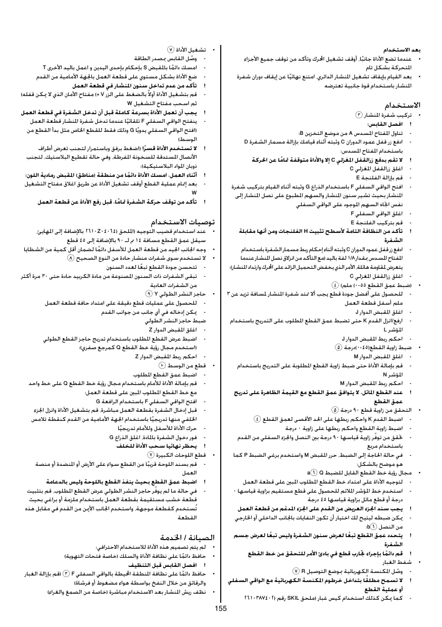 ث) انتبه دائمً ا إلى أن الواقي السفلي يغطي النصل قبل وضع املنشار على الطاولة أو األرضية؛ فوجود نصل مستمر في الدوران وغير محمي سيؤدي إلى حتريك املنشار للخلف وقطع أي شيء يوجد في مساره .انتبه جي ًدا إلى الوقت الذي يستغرقه النصل حتى يتوقف بعد حترير املفتاح؛ حتذيرات السالمة اإلضافية معلومات عامة • ال يجب استخدام هذه األداة من قبل األشخاص األقل من 16عام؛ • هذه األداة غير مالئمة للقطع املبلل • احرص دائمً ا على فصل القابس من مصدر الطاقة قبل القيام بأية عمليات ضبط أو تغيير أية ملحقات؛ • يحظر نهائ ًيا استخدام األداة في حالة تلف السلك ،بل قم باستبداله من قبل أحد األفراد املؤهلني • ال تعمل باستخدام مواد تشتمل على األسبستوس (يعتبر األسبستوس مادة مسرطنة)؛ • الغبار الناجت من املواد كالطالء الذي يحتوي على رصاص وبعض أنواع األخشاب واملعادن واملكونات املعدنية قد يكون ضارًا (مالمسة أو استنشاق الغبار قد تتسبب في إصابة املشغل أو من يجاوره بأمراض احلساسية و/أو أمراض اجلهاز التنفسي)؛ قم بارتداء قناع للغبار مع العمل باستخدام جهاز شفط للغبار ،طاملا أمكن توصيله • ثمة أنواع معينة من الغبار تُصنف على أنها مواد مسببة للسرطان (مثل غبار خشب البلوط والزان) خاصة عند استخدامها مع مواد مضافة ملعاجلة اخلشب؛ قم بارتداء قناع للغبار مع العمل باستخدام جهاز شفط للغبار ،طاملا أمكن توصيله • التزم باملتطلبات الوطنية اخلاصة بالغبار عند العمل باستخدام املواد املطلوبة • ال تستخدم سوى طاولة النشر املزودة مبفتاح يحمي من إعادة تشغيل احملرك بعد انقطاع اجلهد الكهربي • ال تستخدم سوى طاولة النشر املزودة بدليل القطع امللحقات • تضمن SKILالتشغيل السليم لألداة فقط عند استخدام امللحقات األصلية؛ • استخدم فقط امللحقات بالسرعة املسموح بها ،والتي توافق على األقل أعلى سرعة لألداة بدون حمل؛ • ال تستخدم سوى أنصال مناشير التي يبلغ قطرها 170مم بحد أدنى و 170مم بحد أقصى ،وقطر فتحة عمود الدوران 16مم؛ • يحظر نهائ ًيا استخدام شفرة منشار مصنوعة من الفوالذ عالي السرعة )(HSS • يحظر نهائ ًيا استخدام أقراص جلخ/قطع مع هذه األداة قبل االستخدام • تأكد دائ ًما من أن الفولت املزود هو نفسه املشار اليه على اللوحة اخلاصة باألداة (ميكن كذلك توصيل األدوات ذات التصنيف 230فولت أو 240فولت مبصدر إمداد 220فولت)؛ • جتنب التلف الذي قد تتسبب فيه البراغي واملسامير والعناصر األخرى املوجودة في القطعة التي تعمل بها ،قم بفكهم قبل بدء العمل؛ • قبل بدء القطع قم بإزالة جميع العوائق التي توجد أعلى وأسفل مسار القطع • ثبت قطعة العمل (اإلمساك بقطعة عمل مثبتة بأجهزة تثبيت أو في ملزمة أكثر أمان ًا من مسكها باليد)؛ • استخدم كاشفات مالئمة للعثور على خط املرافق أو اطلب شركة املرافق احمللية للحصول على مساعدة (التالمس مع خطوط إمداد الكهرباء قد يؤدي إلى حدوث حريق أو صدمة كهربائية؛ وتلف خط الغاز قد يؤدي إلى حدوث انفجار؛ واختراق أنابيب املياه سيتسبب في حدوث ضرر في املمتلكات أو صدمة كهربائية)؛ • استخدم أسالك متديد مفكوكة متا ًما وآمنة سعة 16أمبير (13أمبير في بريطانيا العظمى) أثناء االستخدام • قد يزيد مستوى الضوضاء أثناء العمل عن 85ديسيبل (أ) ،لذا قم بارتداء واقيات لألذن • يحظر نهائ ًيا استخدام األداة بدون نظام احلماية األصلي للوقاية • ال حتاول قص قطع صغيرة جدا • ال تستخدم األداة فوق مستوى الرأس • في حالة حدوث انحشار أو خلل كهربائي أو ميكانيكي ،أوقف تشغيل األداة فورًا وافصل القابس • في حالة تعرض السلك للتلف أو لقطع أثناء العمل ،ال تلمس السلك وافصل القابس فورًا