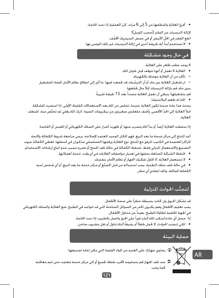 في حال وجود مشكلة ال يوجد عطب ظاهر على الغالية •الغالية ال تعمل أو أنها تتوقف قبل غليان املاء. – –تأكد من أن الغالية موصلة بالكهرباء. الترسبات قد جتمعت فيها ،مما أدّى إلى انطالق نظام األمان املضاد للتشغيل – –مت تشغيل الغالية دون ماء ،أو أن ّ جتمعها. بدون ماء .قم بإزالة الترسبات أوال ً حال ّ قم بتشغيلها :ينبغي أن تعمل الغالية مجددا ً بعد 15دقيقة تقريبا ً. •املاء له طعم البالستيك: يحدث هذا عادة عندما تكون الغالية جديدة .تخلص من املاء بعد االستعماالت القليلة األولى .إذا استمرت املشكلة، امأل الغالية إلى احل ّد األقصى ،وأضف ملعقتني صغيرتني من بيكربونات الصودا .اترك املاء يغلي ثم تخلّص منه .اشطف الغالية. إذا سقطت الغالية أرضا ً ،أو بدأ املاء يتسرب منها ،أو ظهرت أضرار على السلك الكهربائي أو املقبس أو القاعدة أعد املنتج إلى مركز خدمة ما بعد البيع ،فهو املكان الوحيد املعتمد إلصالحه .يرجى مراجعة شروط الكفالة والئحة املراكز املعتمدة في الكتيب املرفق مع املنتج .نوع الغالية ورقمها التسلسلي مذكوران في أسفلها .تغطي الكفالة عيوب التصنيع واالستعمال املنزلي فقط .تسقط الكفالة في حالة تلف املنتج أو تضرره بسبب عدم اتباع إرشادات االستخدام. •حتتفظ الشركة املصنّعة بحقها في تعديل مواصفات الغاليات في أي وقت ،خدمة لعمالئها. •ال تستعمل الغالية .ال حتاول تفكيك اجلهاز أو نظام األمان بنفسك. •في حالة تلف سلك التغذية ،يجب استبداله من قبل املُصنِّع أو مركز خدمة ما بعد البيع ،أو أي شخص لديه الكفاءة املماثلة ،وذلك لتفادي أي خطر.