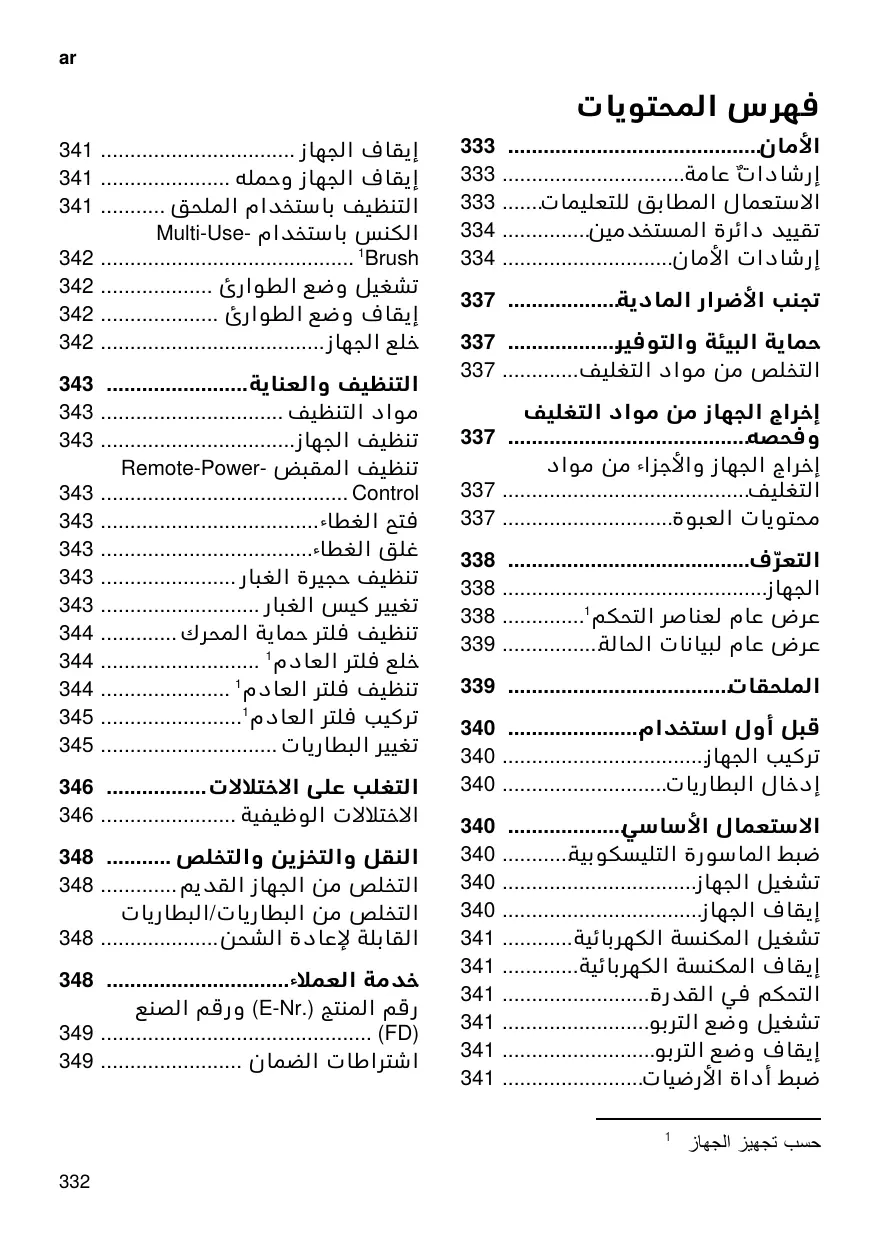 إيقاف الجهاز 341 ................................. إيقاف الجهاز وحمله 341 ...................... التنظيف باستخدام الملحق 341 ........... الكنس باستخدام Multi-Use- 342 ........................................... 1Brush تشغيل وضع الطوارئ 342 ................... إيقاف وضع الطوارئ 342 .................... خلع الجهاز 342 ...................................... التنظيف والعناية343 ........................ مواد التنظيف 343 ............................... تنظيف الجهاز343 ................................. تنظيف المقبض Remote-Power- 343 .......................................... Control فتح الغطاء 343 ..................................... غلق الغطاء343 .................................... تنظيف حجيرة الغبار 343 ....................... تغيير كيس الغبار 343 ........................... تنظيف فلتر حماية المحرك 344 ............. خلع فلتر العادم344 ........................... 1 تنظيف فلتر العادم344 ...................... 1 تركيب فلتر العادم345 ........................1 تغيير البطاريات 345 .............................. التغلب على االختالالت 346 ................. االختالالت الوظيفية 346 ....................... النقل والتخزين والتخلص 348 ........... التخلص من الجهاز القديم 348 ............. التخلص من البطاريات/البطاريات القابلة إلعادة الشحن 348 .................... خدمة العمالء 348 ............................... رقم المنتج ) (E-Nr.ورقم الصنع )349 .............................................. (FD اشتراطات الضمان 349 ........................