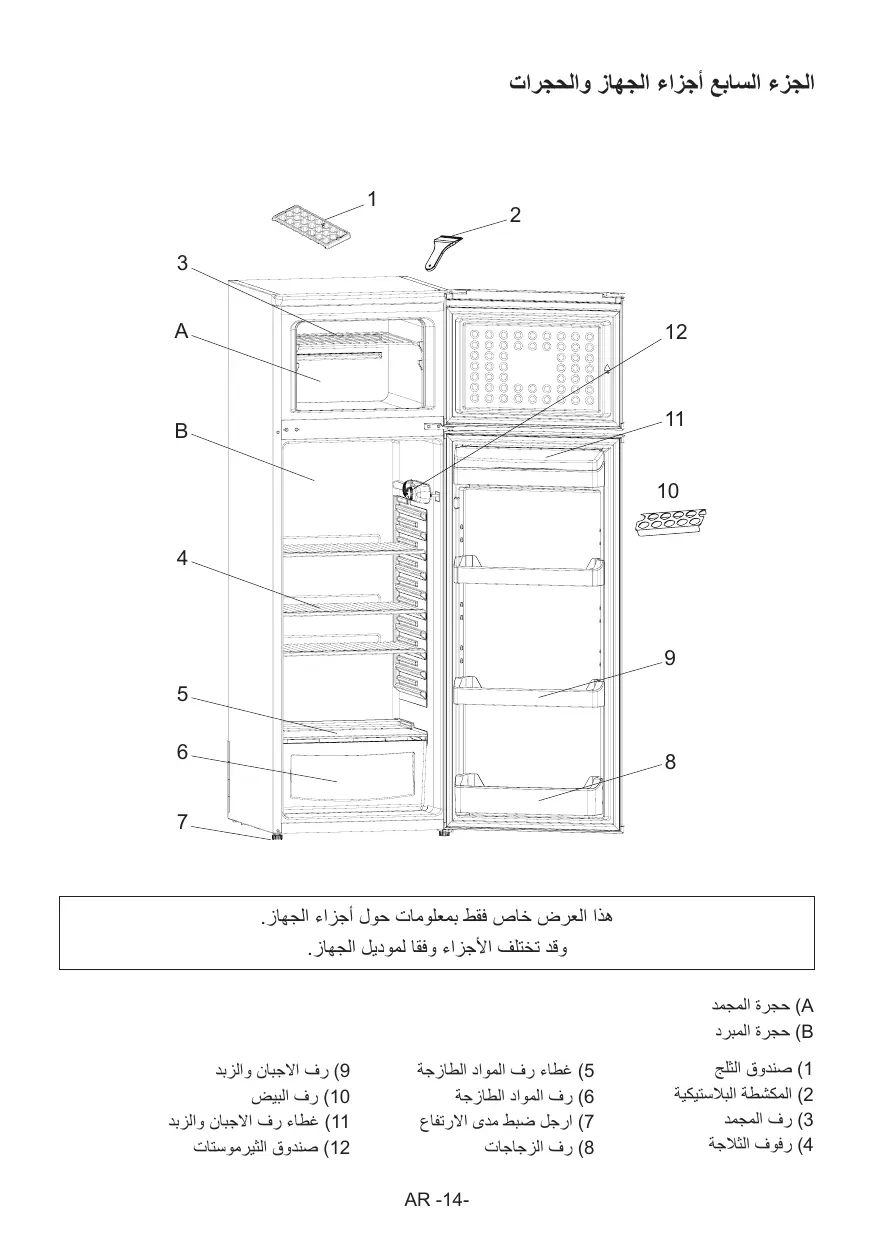 هذا العرض خاص فقط بمعلومات حول أجزاء الجهاز. وقد تختلف األجزاء وفقا لموديل الجهاز. )Aحجرة المجمد )Bحجرة المبرد )1صندوق الثلج )2المكشطة البالستيكية )3رف المجمد )4رفوف الثالجة )5غطاء رف المواد الطازجة )6رف المواد الطازجة )7ارجل ضبط مدى االرتفاع )8رف الزجاجات AR -14- )9رف االجبان والزبد )10رف البيض )11غطاء رف االجبان والزبد )12صندوق الثيرموستات التخلص من االجهزه المستخدمة “وفق هذا المنتج مميز بعالمة التوافق مع المواصفة األوروبية EU/2012/19الخاصة باألجهزة الكهربائية واإللكترونية (.)WEEE األجهزة WEEEتحتوي على مواد ملوثة (يمكنها أن تتسبب في نتائج سلبية على البيئة) ومكونات أساسية (يمكن إعادة استخدامها) .من الهام أن يتم إخضاع أجهزة WEEEلعمليات معالجة خاصة حتى يمكن التخلص من كل الملوثات بشكل مناسب واستعادة وإعادة تدوير كل الخامات. األفراد يمكنهم لعب دور هام فيما يتعلق بضمان أال تصبح أجهزة WEEEعبئًا بيئيًا ،من الضروي أن يتم اتباع بعض القواعد األساسية: أجهزة WEEEال يتعين التعامل معها باعتبارها ضمن النفايات المنزلية، أجهزة WEEEيتعين أن يتم تسليمها إلى مراكز التجميع ذات الصلة التي تقوم على إدارتها البلديةأو الشركات المتخصصة .في العديد من البلدان ،بالنسبة ألجهزة WEEEالكبيرة ،يتعين أن تكون هناك خدمة تجميع منزلية. في العديد من البلدان ،عندما تقوم بشراء جهاز جديد ،يمكن أن يتم إرجاع القديم إلى تاجر التجزأة الذي عليه أن يقوم بجمعه مجانًا بقاعدة واحد مقابل واحد ،طالما أن الجهازين من نفس النوع ولهما نفس الوظائف.