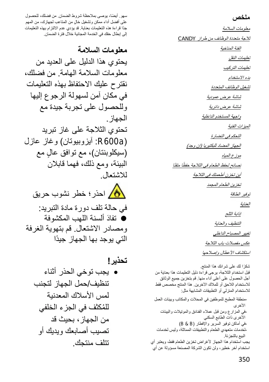 معلومات السالمة ثالجة متعددة الوظائف من طراز CANDY الفئة المناخية تعليمات النقل تعليمات التركيب بدء االستخدام تشغيل الوظائف المتعددة شاشة عرض عمودية شاشة عرض دائرية واجهة المستخدم الداخلية الميزات الفنية التحكم في النضارة الجهاز المضاد للبكتيريا (إن وجد) موزع المياه نصائح لحفظ الطعام في الثالجة حف ًظا متقنًا أين تخزن أطعمتك في الثالجة سهو .أيضًا ،يوصى بمالحظة شروط الضمان .من فضلك ،للحصول على أفضل أداء ممكن وتشغيل خا ٍل من المتاعب لجهازك ،من المهم جدًا قراءة هذه التعليمات بعناية .قد يؤدي عدم االلتزام بهذه التعليمات إلى إبطال حقك في الخدمة المجانية خالل فترة الضمان. معلومات السالمة يحتوي هذا الدليل على العديد من معلومات السالمة الهامة .من فضلك، نقترح عليك االحتفاظ بهذه التعليمات في مكان آمن لسهولة الرجوع إليها وللحصول على تجربة جيدة مع تحتوي الثالجة على غاز تبريد ( :R600aآيزوبيوتان) وغاز عازل (سيكلوبنتان) ،مع توافق عا ٍل مع البيئة ،ومع ذلك ،فهما قابالن