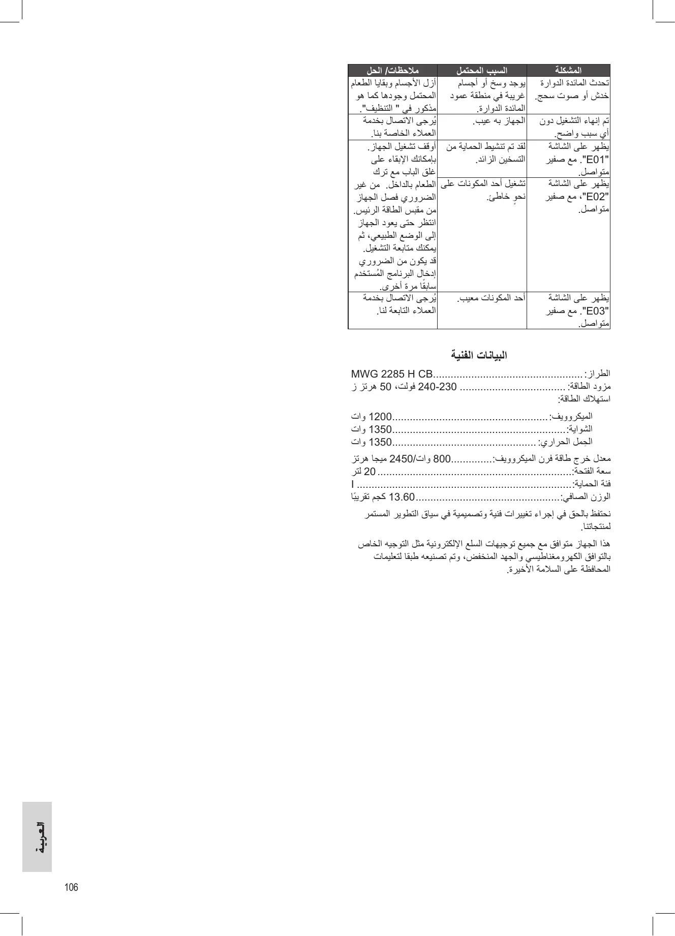 مالحظات /الحل السبب المحتمل أزل األجسام وبقايا الطعام تحدث المائدة الدوارة يوجد وسخ أو أجسام خدش أو صوت سحج .غريبة في منطقة عمود المحتمل وجودها كما هو مذكور في " التنظيف". المائدة الدوارة. يُرجى االتصال بخدمة تم إنهاء التشغيل دون الجهاز به عيب. العمالء الخاصة بنا. أي سبب واضح. يظهر على الشاشة لقد تم تنشيط الحماية من أوقف تشغيل الجهاز. التسخين الزائد. " ."E01مع صفير بإمكانك اإلبقاء على غلق الباب مع ترك يظهر على الشاشة تشغيل أحد المكونات على الطعام بالداخل .من غير " ،"E02مع صفير الضروري فصل الجهاز