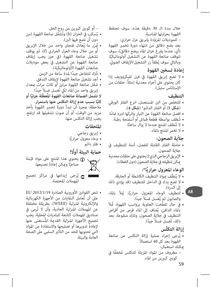 • Verseuse verre • Todas las tareas de mantenimiento, salvo tareas de limpieza y conservación de • Mantenga el aparato y el cable las rutina realizadas por el cliente, deben de alimentación fuera del llevarse a cabo en un centro de servicio alcance de los niños menores • oficial. El cable de alimentación nunca debe estar cerca de piezas calientes del aparato, de 8 años. fuentes de calor o ángulos pronunciados 28