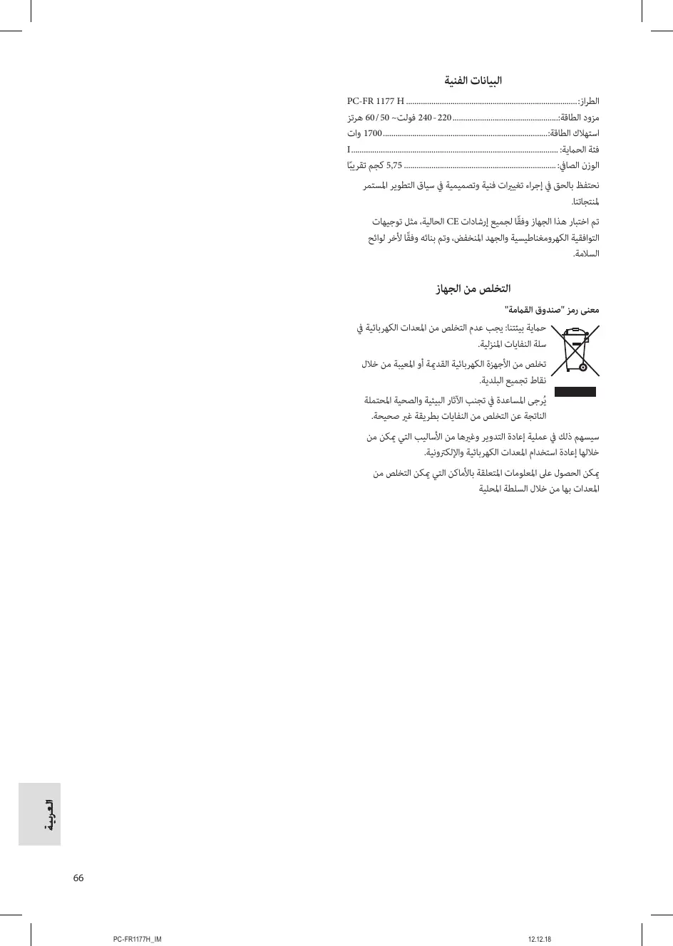 Modèle : PC-FR 1177 H Alimentation : 220 - 240 V~, 50 / 60 Hz Consommation :1700 W Classe de protection : électriques, les bornes de collecte prévues à cet effet où vous pouvez vous débarrasser des appareils que vous n’utilisez plus. Vous contribuez ainsi à éviter les impacts potentiels dans l’environnement et sur la santé de chacun, causés par une mauvaise élimination de ces déchets. Vous contribuez aussi au recyclage sous toutes ses formes des appareils électriques et électroniques usagés. Vous trouverez toutes les informations sur les bornes d’élimination des appareils auprès de votre commune ou de l’administration de votre communauté.