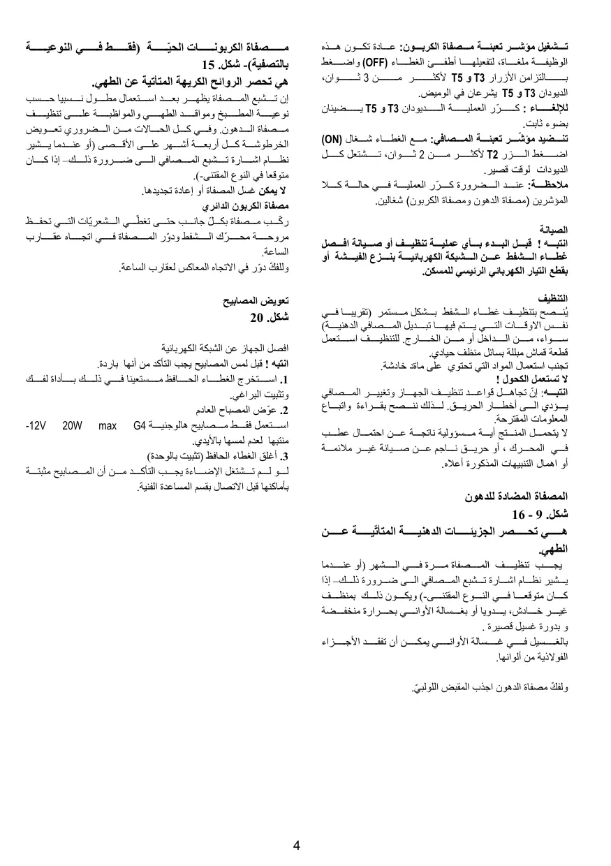 ت شغيل مؤش ر تعبئ ة م صفاة الكرب ون :ع ادة تك ون ھ ذه الوظيف ة ملغ اة ،لتفعيلھ ا أطف ئ الغط اء ) (OFFواض غط وان، ن3ث ر م التزامن األزرار T3و T5ألكث ب الديودان T3و T5يشرعان في الوميض. لإللغ اء :ك رّر العملي ة ال ديودان T3و T5ي ضيئان بضوء ثابت. تن ضيد مؤ ّ ش ر تعبئ ة الم صافي :م ع الغط اء ش غال )(ON اض غط ال زر T2ألكث ر م ن 2ث وان ،ت شتعل ك ل الديودات لوقت قصير. مالحظ ة :عن د ال ضرورة ك رّر العملي ة ف ي حال ة ك ال المؤشرين )مصفاة الدھون ومصفاة الكربون( شغالين.