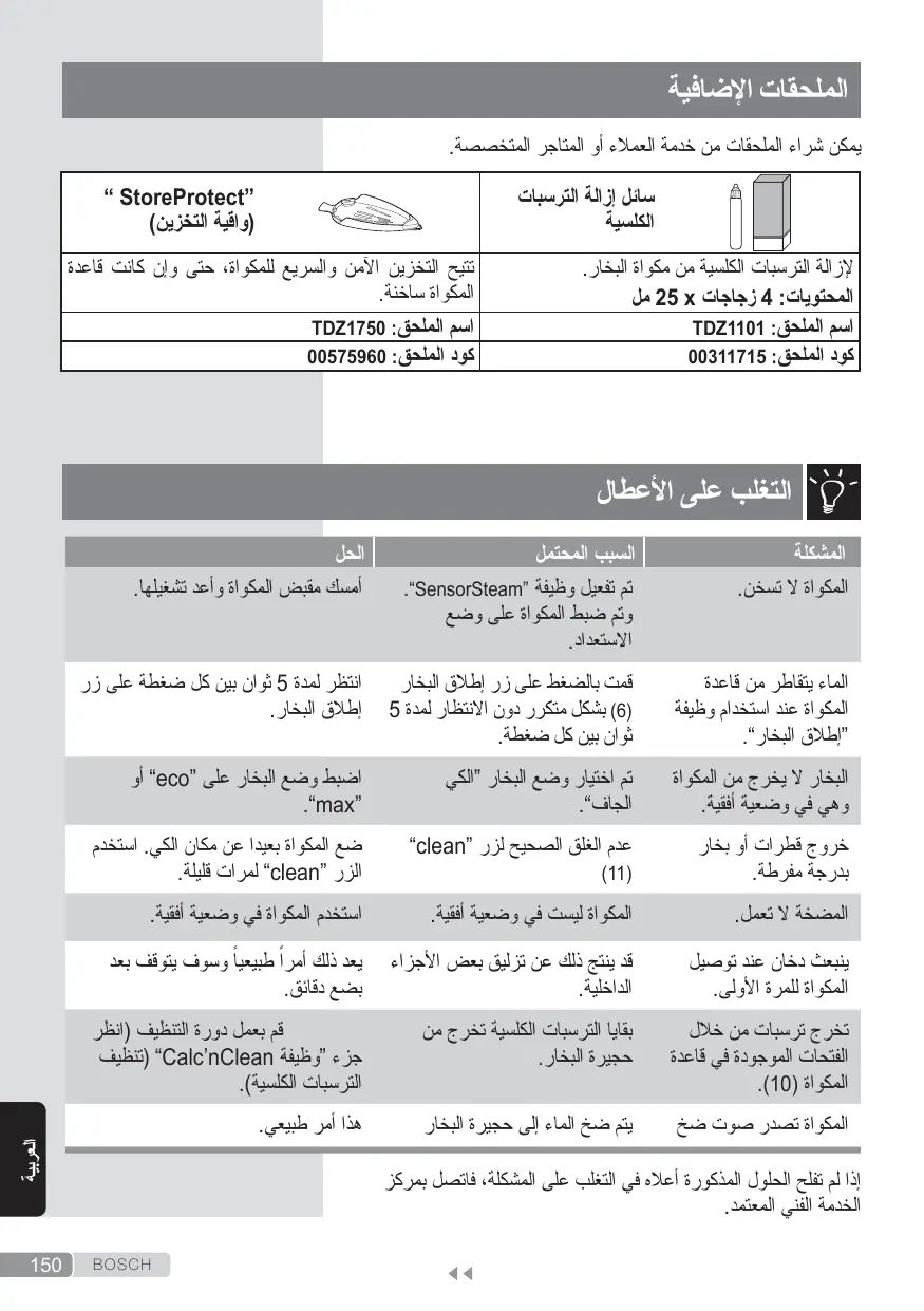 الملحقات اإلضافية يمكن شراء الملحقات من خدمة العمالء أو المتاجر المتخصصة. سائل إزالة الترسبات الكلسية إلزالة الترسبات الكلسية من مكواة البخار. المحتويات 4 :زجاجات 25 xمل اسم الملحقTDZ1101 : كود الملحق00311715 :