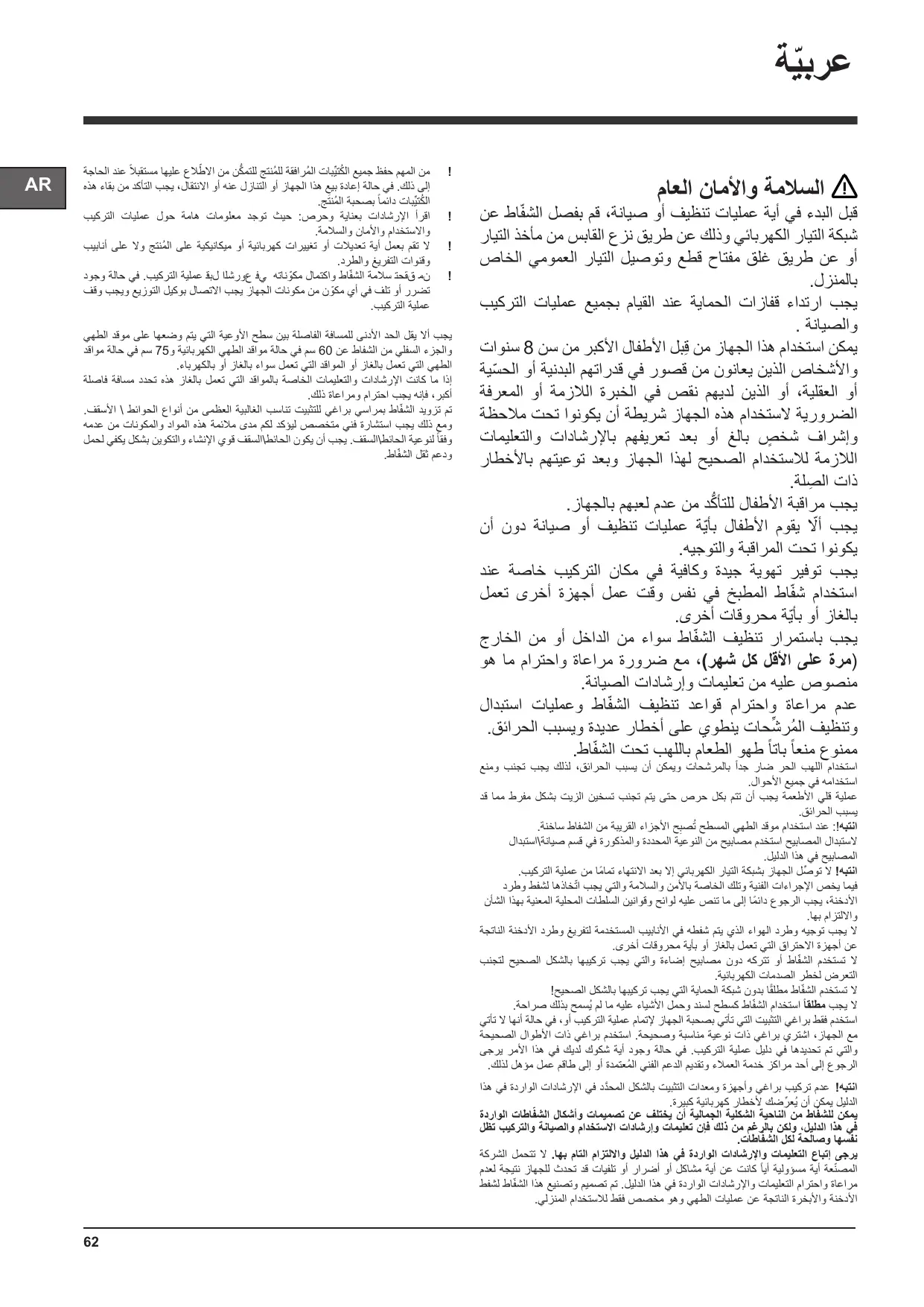 La pièce doit avoir une aération suffisante lorsque la hotte est utilisée conjointement avec d'autres appareils fonctionnant au gaz ou autres combustibles. La hotte doit être régulièrement nettoyée à la fois à l'intérieur et à l'extérieur (AU MOINS UNE FOIS PAR MOIS); cela devrait se faire en conformité avec les instructions d'entretien. Le non respect des instructions expressément fournies concernant le nettoyage de la hotte et des filtres peut provoquer des risques d'incendie. Ne pas flamber d’aliments sous la hotte.