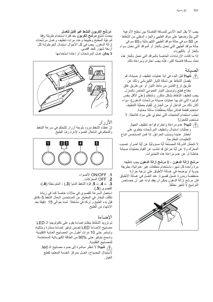 Avant toute opération de nettoyage ou d’entretien, débranchez l’alimentation électrique en retirant la fiche ou en coupant l’interrupteur général. Utilisez de gants de travail pour toute opération de nettoyage ou d’entretien. L’appareil peut être utilisé par les enfants âgés pas moins de 8 ans et les personnes ayant des capacités réduites physiques, sensorielles ou mentales, ou sans l’expérience ou les connaissances nécessaires, uniquement sous surveillance ou après ils ont reçu des instructions relatives à l’utilisation en sécurité de l’appareil et ont compris les dangers inhérents. Les enfants doivent être surveillés pour s’assurer qu’ils ne jouent pas avec l’appareil. Le nettoyage et l’entretien ne doivent pas être effectués par des enfants sans surveillance. La pièce doit avoir une aération suffisante lorsque la hotte est utilisée conjointement avec d’autres appareils fonctionnant au gaz ou autres combustibles. La hotte doit être régulièrement nettoyée à la fois à l’intérieur et à l’extérieur (AU MOINS UNE FOIS PAR MOIS); cela devrait se faire en conformité avec les instructions d’entretien dans ce manuel. Le non