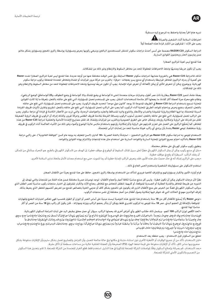 Ce produit n’est pas un jouet pour jeunes utilisateurs ! Vous devez être prudent, attentif et prendre des précautions raisonnables pour réduire au minimum les risques de chute, d’accident ou autres problèmes. Le Razor C25 est donc nécessairement à la fois comparable, mais par beaucoup d’aspects, différent des précédents scooters Razor. Ce produit n’est pas un jouet pour jeunes utilisateurs ! Razor souligne donc l’importance pour les utilisateurs de bien comprendre les risques associés à l’utilisation de quasiment tout produit à roues près de la circulation des véhicules ou des piétons ainsi que les risques spécifiques à conduire un scooter électrique. Pour le dire brutalement, vous pourriez être blessé et vos actions pourraient causer des blessures à d’autres. Vous devez être prudent, attentif et prendre des précautions raisonnables pour réduire au minimum les risques de chute, d’accident ou autres problèmes. Pour l’essentiel, le Razor C25 a une autonomie sur batterie supérieure, plusieurs options de vitesse (Mode piéton jusqu’à 6 km/h, Mode croisière jusqu’à 15 km/h (9,3 mph) et Mode sport jusqu’à 25 km/h (15,5 mph)), et un système de propulsion à moteur dans le moyeu plus efficace qui le destine plus aux usages de « trajet domicile-travail ». L’utilisateur doit être et est de toute façon responsable de la vérification de la possibilité d’utiliser le Razor C25 dans diverses circonstances d’après les lois locales (il n’y a pas de « loi internationale uniforme » actuellement pour définir des conditions d’utilisation universelles). Le conducteur doit être et est de toute façon responsable d’agir de façon raisonnée, prudente et dans le respect des règles du code de la route local pendant la conduite, et ce conducteur doit être et est de toute façon responsable de l’évaluation et de la prise en compte des conditions de conduite potentiellement néfastes, notamment conditions d’éclairage ou de visibilité insuffisantes, brouillard, pluie, neige, grêle, verglas ou orages à éclairs, qui augmentent les dangers inhérents à l’utilisation de tout scooter. Le conducteur doit être et est de toute façon responsable de l’ajustement de son comportement de conduite et de sa distance de freinage en fonction des conditions météorologiques et de circulation, ainsi que de prendre en compte la diminution des possibilités de voir et être vu par faible visibilité, en particulier sur route publique et près de véhicules ou de piétons. Les feux avant et arrière du Razor C25 peuvent réduire ces risques, et les utilisateurs sont aussi encouragés à améliorer leur visibilité ou leur signalisation par des vêtements à haute visibilité, des feux ou autres éléments réfléchissants pour conduire par visibilité réduite. Razor recommande aussi absolument à tout utilisateur de porter un casque approprié pour limiter les blessures potentielles à la tête. L’utilisation du scooter Razor C25 est recommandée aux conducteurs adultes -- avec un âge conseillé de plus de 18 ans (généralement considéré comme un âge de « consentement juridique »). Les utilisateurs du Razor C25 doivent assurément respecter et adopter toutes les lois et règles applicables localement à l’utilisation de ces produits. L’utilisation d’une trottinette électrique présente des risques potentiels. • Comme tout autre produit mobile, une trottinette électrique peut être dangereuse (par exemple, on peut tomber ou être confronté à une situation dangereuse). Il va de soi que les trottinettes électriques sont conçues pour se déplacer; il est donc possible que l’utilisateur perde la maîtrise ou soit confronté à des situations dangereuses. • Les utilisateurs doivent comprendre que si une telle situation se présente, un utilisateur peut subir des blessures graves, voire mortelles, même s’il utilise l’équipement de sécurité et qu’il respecte les autres précautions de sécurité. UTILISER LES TROTTINETTES À VOS PROPRES RISQUES ET FAIRE PREUVE DE BON SENS. La présence d’un parent ou d’un adulte responsable est indispensable pour s’assurer de l’utilisation par des conducteurs novices. Conserver ce produit hors de portée des enfants. Parce que les trottinettes peuvent être dangereuses et que tout produit n’est pas approprié aux enfants de tout âge ou de toute taille, il existe différentes recommandations relatives à l’âge dans cette catégorie de produits, qui ont pour but de refléter la nature des dangers et les capacités physiques ou mentales prévues, ou les deux, qu’un enfant possède pour faire face aux dangers. Les parents et les adultes chargés de surveiller les enfants doivent choisir des produits mobiles adaptés à l’âge de l’enfant qui utilisera la trottinette électrique et prendre les précautions afin d’éviter que les enfants trop immatures ou inexpérimentés pour les caractéristiques d’un produit se mettent en danger. Une supervision par les parents est essentielle quand des enfants d’âge différent peuvent avoir accès à ces produits. • La société Razor recommande que l’usage de ce produit ne soit pas permis aux enfants âgés de moins de 18 ans. Cette recommandation est fondée non, tout simplement, sur l’âge, le poids ou la taille ; mais elle reflète la prise en compte de la maturité attendue ainsi que l’aspect physique. L’âge recommandé de 18 ans ou plus est seulement une estimation, et il peut être affecté par la taille, le poids ou les capacités de l’utilisateur. - ce produit ne sera pas considéré comme convenant, d’emblée, pour chaque enfant âgé de 18 ans. • Poids maximal du conducteur 100 kg – y compris sacs à dos et autres articles pouvant être transportés. Toute charge fixée au guidon dégrade la stabilité du scooter électrique. • Toute personne présentant des problèmes mentaux ou physiques 