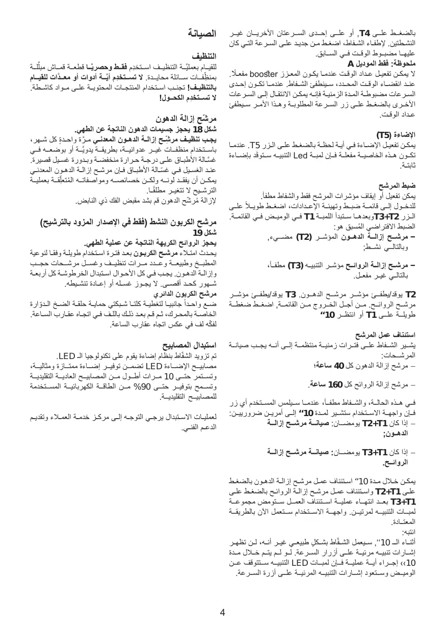 بالضغــط علــى ,T4أو علــى إحــدى الســرعتان األخريــان غيــر النشــطتين .إلطفــاء الشــفاط ،اضغــط مــن جديــد علــى الســرعة التــي كان عليهــا مضبــوط الوقــت فــي الســابق. ملحوظة :فقط الموديل A ال يمكــن تفعيــل عــداد الوقــت عندمــا يكــون المعــزز boosterمفعـ ًـا. عنــد انقضــاء الوقــت المحــدد ،ســينطفئ الشــفاط .عندمــا تكــون إحــدى الســرعات مضبوطــة المــدة الزمنيــة فإنــه يمكــن االنتقــال إلــى الســرعات األخــرى بالضغــط علــى زر الســرعة المطلوبــة وهــذا األمــر ســيطفئ عــداد الوقــت.