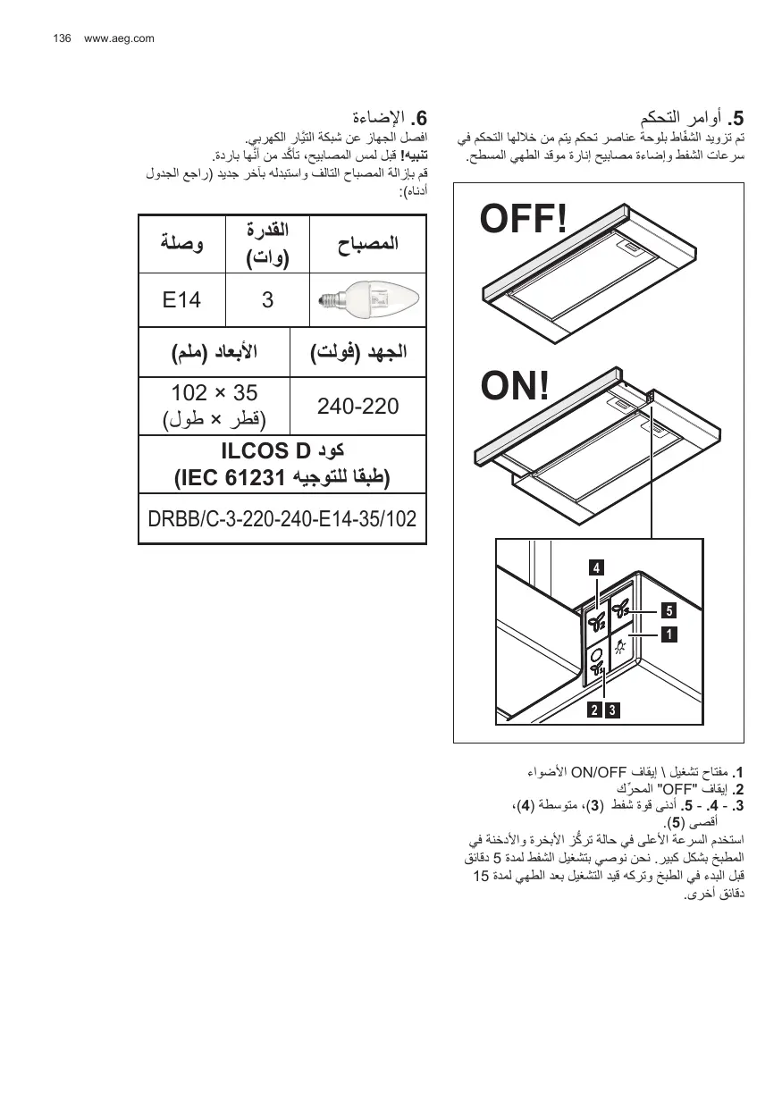 .1مفتاح تشغيل \ إيقاف ON/OFFاألضواء .2إيقاف " "OFFالمحرِّ ك .5 - .4 - .3أدنى قوة شفط ( ،)3متوسطة (،)4 أقصى (.)5 استخدم السرعة األعلى في حالة تر ُّكز األبخرة واألدخنة في المطبخ بشكل كبير .نحن نوصي بتشغيل الشفط لمدة 5دقائق قبل البدء في الطبخ وتركه قيد التشغيل بعد الطهي لمدة 15 دقائق أخرى.