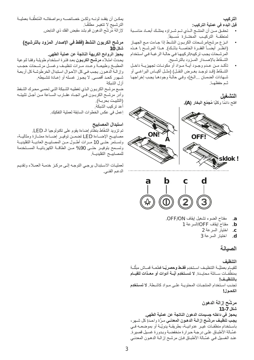 • قبــل أيــة عمليــة نظافــة أو صيانــة ،افصــل الشــفاط عــن الشــبكة الكهربائيــة عــن طريــق نــزع القابــس أو فصــل المفتــاح العــام للمنــزل. • مــن أجــل إجــراء كافــة عمليــات التركيــب والصيانــة اســتخدم قفــازات عمــل. • يمكــن اســتخدام هــذا الجهــاز مــن قِبــل األطفال األكبــر مــن ســن 8ســنوات واألشــخاص الذيــن يعانــون مــن قصــور فــي قدراتهــم البدنيــة أو الحســية أو العقليــة ،أو الذيــن لديهــم نقــص ّ فــي الخبــرة الالزمــة أو المعرفــة الضروريــة الســتخدام هــذا الجهــاز شــريطة أن يكونــوا ـخص بالــغ أو بعــد تحــت مالحظــة وإشــراف شـ ٍ تعريفهــم باإلرشــادات والتعليمــات الالزمــة لالســتخدام الصحيــح لهــذا الجهــاز وبعــد توعيتهــم باألخطــار ذات الصِ لــة. • يجــب مراقبــة األطفــال حتــى ال يلعبــوا با لجهــا ز . ُ • ال يجــب أن تنفــذ النظافــة والصيانــة مــن قِبــل أطفــال دون مراقبــة.
