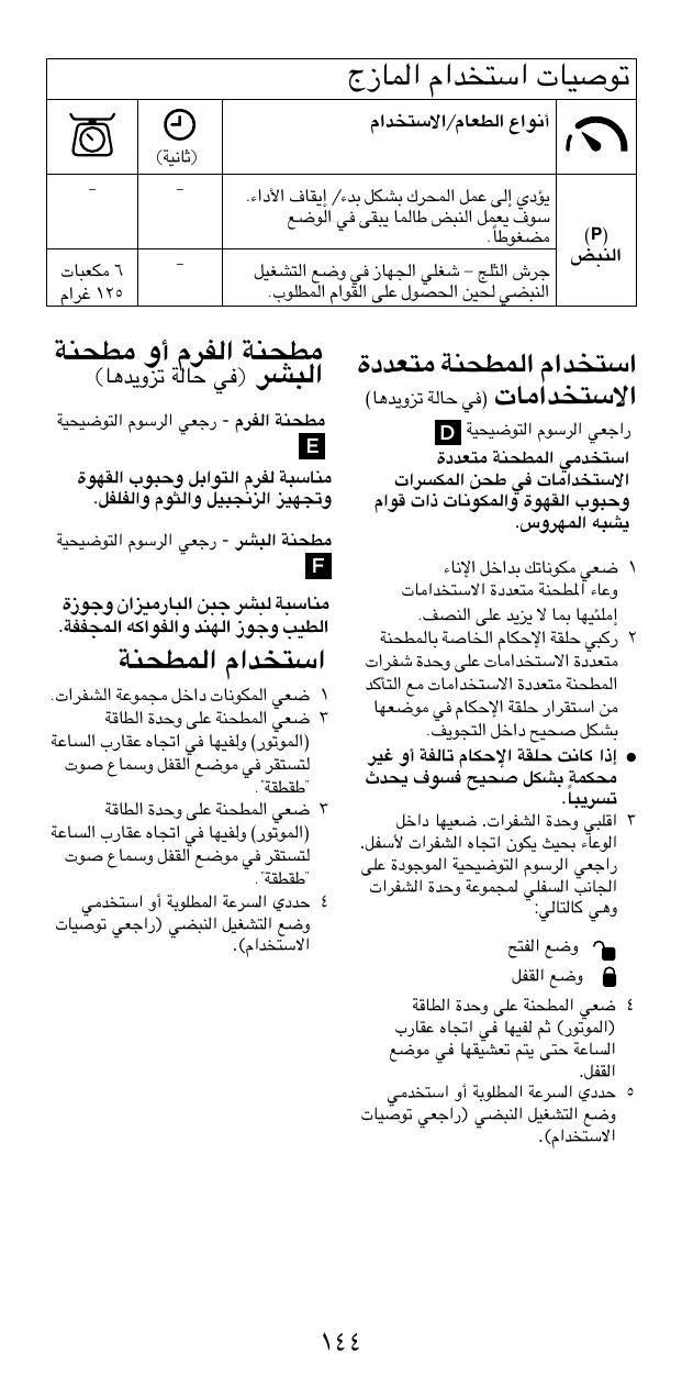 2 Installez le couvercle et verrouillez-le en le tournant dans le sens inverse des aiguilles d’une montre. 3 Placez le moulin sur le bloc moteur et tournez-le dans le sens des aiguilles d’une montre pour le fermer jusqu’à ce que vous entendiez un « clic ». 4 Sélectionnez une vitesse ou utilisez la fonction Pulse (P) (voir Utilisation recommandée).