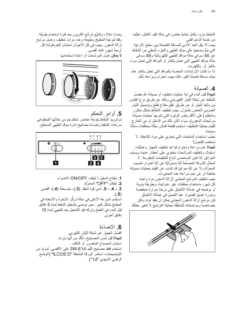 .1مفتاح تشغيل \ إيقاف ON/OFFاألضواء .2إيقاف " "OFFالمحرِّ ك .5 - .4 - .3أدنى قوة شفط ( ،).3متوسطة ( ،).4أقصى (.).5 استخدم السرعة األعلى في حالة تر ُّكز األبخرة واألدخنة في المطبخ بشكل كبير .نحن نوصي بتشغيل الشفط لمدة 5دقائق قبل البدء في الطبخ وتركه قيد التشغيل بعد الطهي لمدة 15 دقائق أخرى.