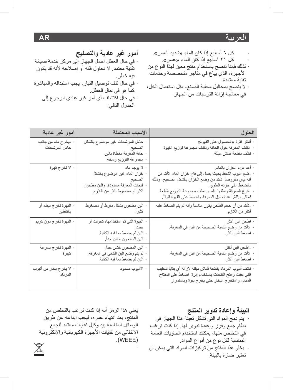 Vérifier que le réservoir soit correctement placé, en appuyant sur sa partie supérieure - Vider le filtre et le nettoyer avec de l’eau. Nettoyer le groupe de distribution avec un chiffon humide. Remplissez de nouveau le filtre et exercer une légère pression.