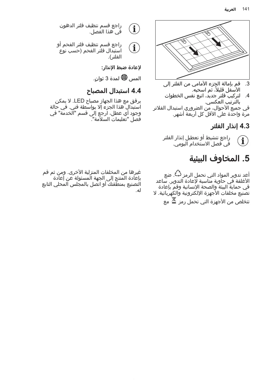Reportez-vous au paragraphe « Activation et désactivation de l’alarme du filtre » du chapitre « Utilisation quotidienne ». Reportez-vous au paragraphe « Nettoyage du filtre à graisse » de ce chapitre. Reportez-vous au paragraphe « Nettoyage du filtre à charbon ou remplacement du filtre à charbon » (en fonction du type de filtre). Pour réinitialiser l'alarme : Appuyez sur