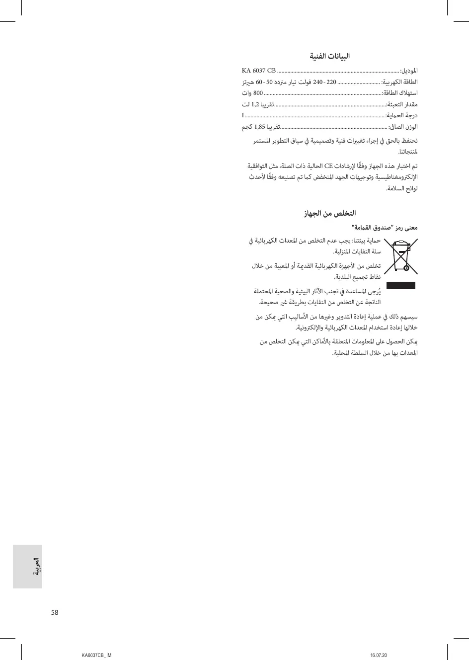 البيانات الفنية املوديلKA 6037 CB....................................................................................: الطاقة الكهربية 240 - 220.............................. :فولت تيار مرتدد 60 - 50هريتز استهالك الطاقة 800.................................................................................:وات مقدار التعبئة.............................................................................:تقريبا 1,2لت درجة الحاميةI................................................................................................: الوزن الصاىف.........................................................................:تقريبا 1,85كجم نحتفظ بالحق يف إجراء تغيريات فنية وتصميمية يف سياق التطوير املستمر تم اختبار هذه الجهاز وفقًا إلرشادات CEالحالية ذات الصلة ،مثل التوافقية اإللكرتومغناطيسية وتوجيهات الجهد املنخفض كام تم تصنيعه وفقًا ألحدث لوائح السالمة. التخلص من الجهاز معنى رمز "صندوق القاممة" حامية بيئتنا :يجب عدم التخلص من املعدات الكهربائية يف سلة النفايات املنزلية. تخلص من األجهزة الكهربائية القدمية أو املعيبة من خالل نقاط تجميع البلدية. يُرجى املساعدة يف تجنب اآلثار البيئية والصحية املحتملة الناتجة عن التخلص من النفايات بطريقة غري صحيحة. سيسهم ذلك يف عملية إعادة التدوير وغريها من األساليب التي ميكن من خاللها إعادة استخدام املعدات الكهربائية واإللكرتونية. ميكن الحصول عىل املعلومات املتعلقة باألماكن التي ميكن التخلص من املعدات بها من خالل السلطة املحلية.