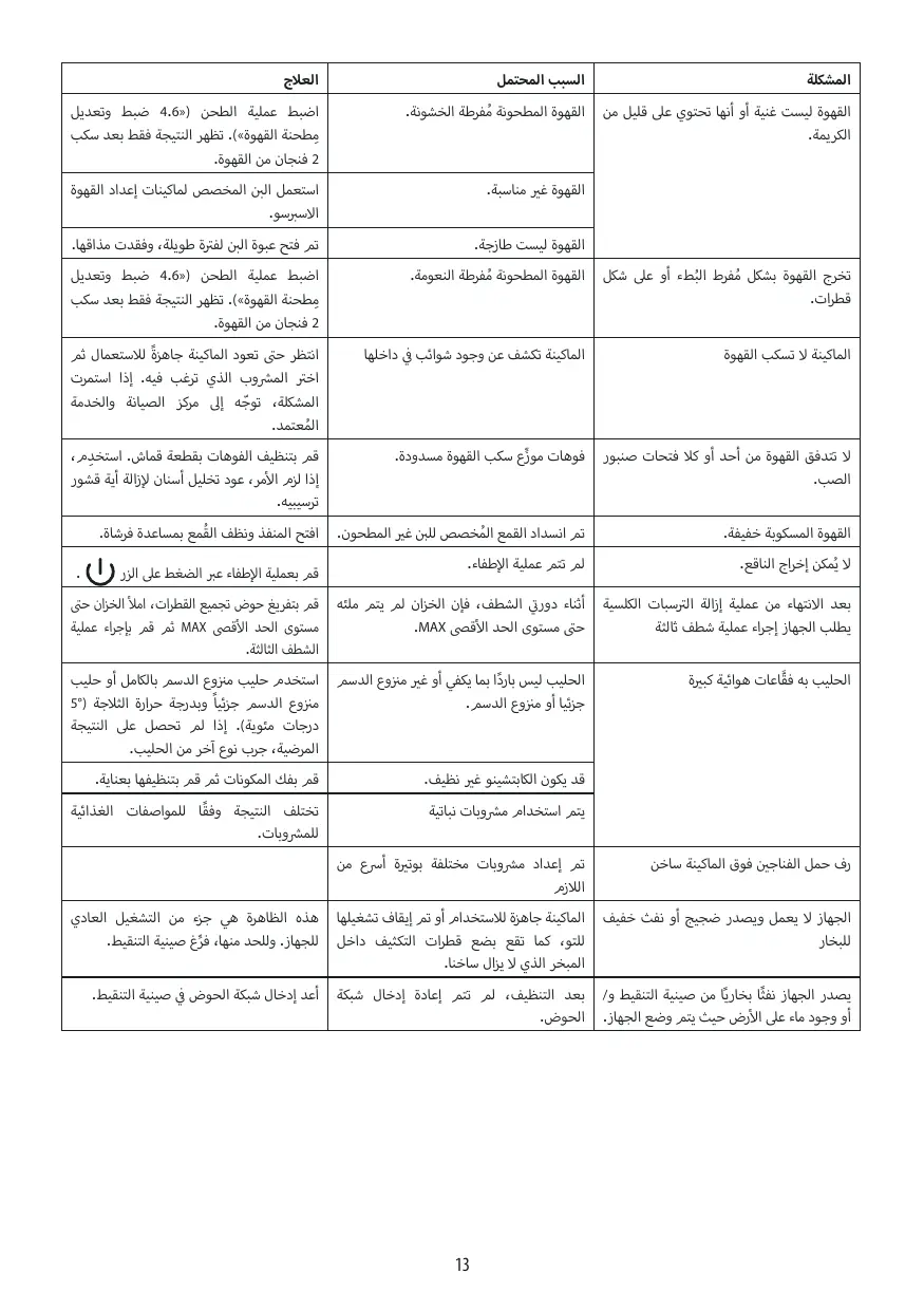 La machine n'est pas utilisée et émet des La machine est prête à l'emploi ou a été Ce phénomène fait partie du fonctionnebruits ou des petits nuages de vapeur éteinte depuis peu et des gouttes de ment normal de l'appareil ; pour limiter condensation tombent à l'intérieur du le phénomène, vider l’égouttoir. vaporisateur encore chaud. L’appareil émet des nuages de vapeur par Après le nettoyage, la grille de l’égouttoir Réinsérer la grille égouttoir dans l’égouttoir et/ou il y a de l’eau sur le plan n’a pas été réinsérée. l'égouttoir. où est placé l’appareil .
