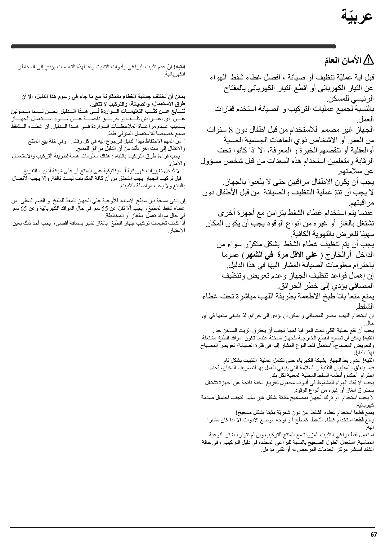 La pièce doit avoir une aération suffisante lorsque la hotte est utilisée conjointement avec d'autres appareils fonctionnant au gaz ou autres combustibles. La hotte doit être régulièrement nettoyée à la fois à l'intérieur et à l'extérieur (AU MOINS UNE FOIS PAR MOIS); cela devrait se faire en conformité avec les instructions d'entretien. Le non respect des instructions expressément fournies concernant le nettoyage de la hotte et des filtres peut provoquer des risques d'incendie. Ne pas flamber d’aliments sous la hotte.