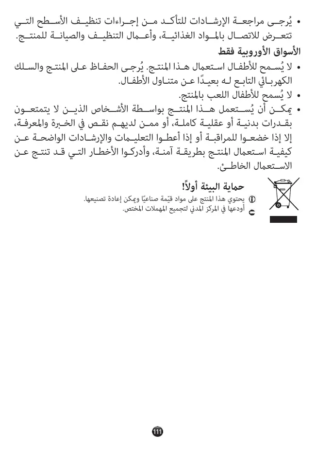 • Il convient de surveiller les enfants pour s’assurer qu’ils ne jouent pas avec l’appareil. • N e pas laisser les enfants utiliser l’appareil sans surveillance. • Cet appareil a été conçu pour un usage domestique seulement. Il n’a pas été conçu pour être utilisé dans les cas suivants qui ne sont pas couverts par la garantie: - Z one de travail de cuisine dans les magasins, bureaux et autres environnements de travail. - D es coins cuisines réservés au personnel dans des magasins, bureaux et autres environnements professionnels. - D es fermes. - L ’utilisation par les clients des hôtels, motels et autres environnements à caractère résidentiel. - D es environnements du type chambres d’hôtes. • Mettez l’appareil à l’arrêt et déconnectez-le de l’alimentation avant de changer les accessoires ou d’approcher les parties qui sont mobiles lors du fonctionnement. • Reportez-vous au mode d’emploi pour le réglage des vitesses et le temps de fonctionnement de chaque accessoire. • Reportez-vous au mode d’emploi pour l’assemblage et le montage des accessoires sur l’appareil. • Reportez-vous au mode d’emploi pour le nettoyage initial et régulier des parties en contact avec les aliments, et pour le nettoyage et l’entretien de votre appareil MARCHES EUROPEENS SEULEMENT • Cet appareil ne doit pas être utilisé par les enfants. Conserver l’appareil et son câble hors de portée des enfants. • L es enfants ne doivent pas utiliser l’appareil comme un jouet. • C et appareil peut être utilisé par des personnes dont les capacités physiques, sensorielles ou mentales sont réduites ou dont l’expérience ou les connaissances ne sont pas suffisantes, à condition qu’ils bénéficient d’une surveillance ou qu’ils aient reçu des instructions 3
