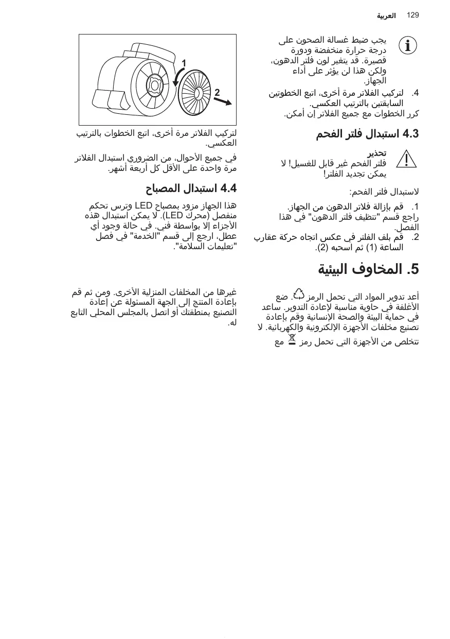ADVERTENCIA! El filtro de carbón NO es lavable. El filtro no se puede regenerar. 4. ENTRETIEN ET NETTOYAGE 40 5. EN MATIÈRE DE PROTECTION DE L'ENVIRONNEMENT 41