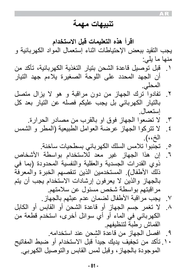 9. RETIRER L’APPAREIL DE SA BASE DE RECHARGE POUR L’UTILISER. 10.Vérifier d’avoir toujours les mains sèches avant d’utiliser ou de régler les interrupteurs placés sur l’appareil ou avant de manipuler la fiche et les connexions électriques. 11.NE JAMAIS TOUCHER LES PARTIES EN MOUVEMENT. 12.Ne faites pas fonctionner l’appareil à vide. 13.N’utilisez pas l’appareil pour hacher des aliments ayant une consistance excessive (exemple: cubes de glaçon ou viande avec os). 14.En cas de substitution et/ou d’entretien de l’alimentateur ou du cordon électrique d’alimentation, s’adresser à un Centre de Service Après-vente Autorisé Ariete ou à une personne ayant une qualification similaire, de façon à prévenir tout risque. 15.En cas de fuite de liquide des piles, l’appareil ne doit pas être utilisé mais apporté au Centre de Service Aprèsvente le plus proche pour la substitution des piles. - 16 -