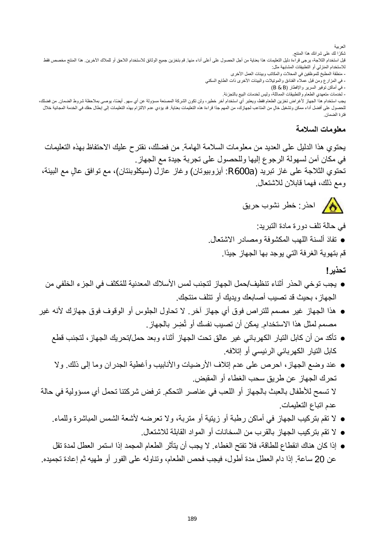 Nous vous suggérons de conserver ces instructions dans un endroit sûr pour une référence ultérieure aisée et une bonne utilisation de l’appareil. Ce réfrigérateur contient un gaz réfrigérant (R600a : isobutane) et un gaz isolant (cyclopentane), qui présentent une compatibilité élevée avec l'environnement mais des propriétés inflammables. Attention : risque d'incendie En cas de dommages du circuit de réfrigérant : • Éviter des flammes ouvertes et des sources d'inflammation. Bien aérer la pièce dans laquelle se trouve l'appareil. AVERTISSEMENT !