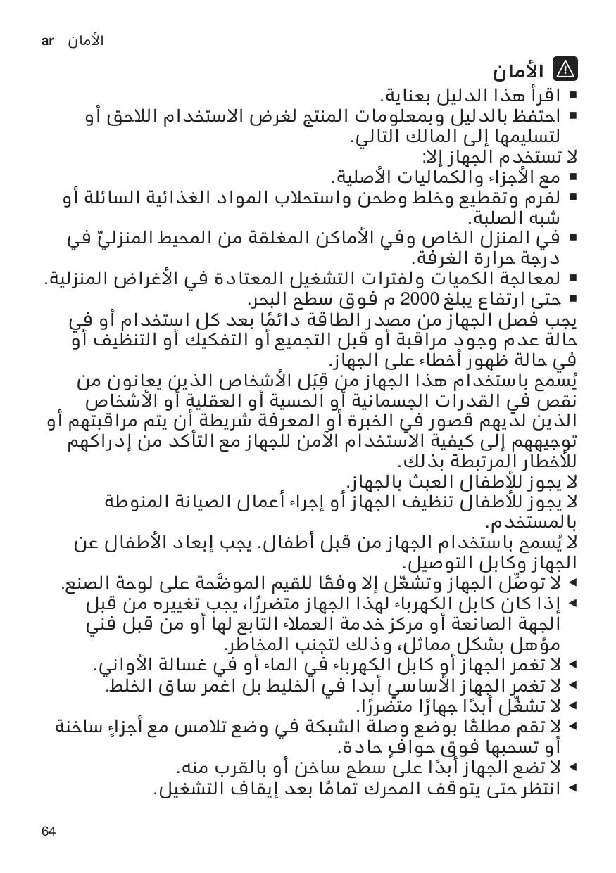 ¡ Read this instruction manual carefully. ¡ Keep the instruction manual and the product information safe for future reference or for the next owner. ¡ pour broyer, hacher, mixer, réduire en purée et émulsionner des produits alimentaires liquides ou mi-ferme. ¡ pour un usage domestique privé et dans les pièces fermées d’un domicile, à la température ambiante. ¡ pour les quantités de préparation et durées de traitement habituelles pour un ménage. ¡ à une hauteur maximale de 2000 m au-dessus du niveau de la mer. L’appareil doit toujours être débranché du secteur, après chaque utilisation, lorsqu’il n’est pas sous surveillance, lorsqu’il doit être monté ou démonté, avant de le nettoyer et en cas de panne. Cet appareil peut être utilisé par des personnes aux capacités physiques, sensorielles ou mentales réduites ou des personnes inexpérimentées, à condition qu'elles soient surveillées ou qu'elles aient été informées de l'utilisation de l'appareil et qu'elles comprennent les risques inhérents à son usage. Les enfants ne sont pas autorisés à jouer avec l'appareil. Le nettoyage et l’entretien de l'appareil ne doivent pas être effectués par des enfants. L'appareil ne doit pas être utilisé par des enfants. Les enfants doivent être tenus à distance de l’appareil et du cordon d’alimentation secteur. ▶ Pour le raccordement et l’utilisation de l’appareil, respectez impérativement les indications figurant sur la plaque signalétique. ▶ Afin d’écarter tout danger quand le cordon d’alimentation secteur de cet appareil est endommagé, seul le fabricant ou son service après-vente ou toute autre personne de qualification équivalente est habilité à le remplacer. ▶ Ne jamais plonger l’appareil ou le cordon d’alimentation secteur dans l’eau et ne pas les mettre au lave-vaisselle. 13