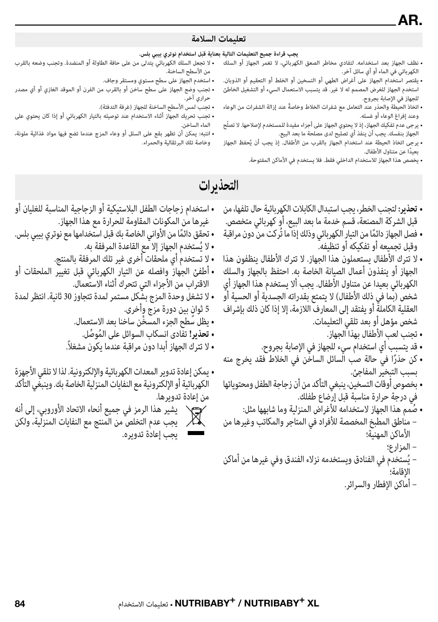 - d es environnements du type de chambres d’hôtes. • Utilisez des biberons en plastique ou en verre pouvant bouillir ou tous autres récipients thermorésistants avec cet appareil. • Vérifiez toujours vos ustensiles avant de les employer avec le Nutribaby+ / XL. • L 'appareil doit seulement être utilisé avec la base fournie. • N e pas utiliser d'accessoires autres que ceux fournis. • Éteignez l'appareil et déconnectez le câble avant de changer des accessoires ou d'approcher des pièces en mouvement pendant l'utilisation. • Ne faites pas fonctionner l'unité de mixage en continu pendant plus de 30 secondes. Attendez cinq secondes entre chaque cycle de mixage. • La surface de l'élément chauffant est soumise à la chaleur résiduelle après utilisation. • A vertissement! Évitez les déversements sur le connecteur. • Ne laissez jamais l'appareil sans surveillance pendant son fonctionnement. • Les équipements électriques et électroniques font l’objet d’une collecte sélective. Ne pas se débarrasser des déchets d’équipements électriques et électroniques avec les déchets municipaux non triés, mais procéder à leur collecte sélective. Ce symbole indique à travers l’Union Européenne que ce produit ne doit pas être jeté à la poubelle ou mélangé aux ordures ménagères, mais faire l’objet d’une collecte sélective.