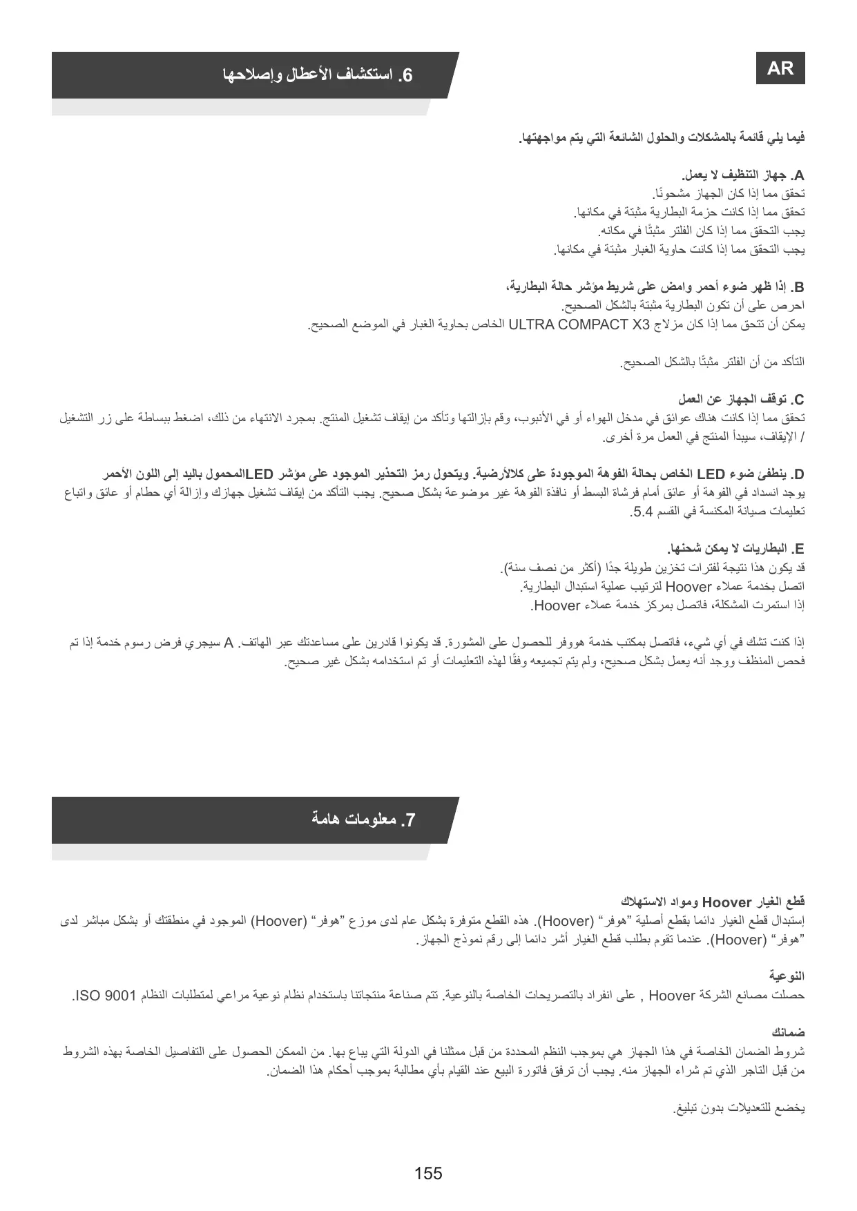 Vérifiez s’il y a une obstruction dans l’entrée d’air ou dans le tube, dégagez-la et assurez-vous que le produit est éteint. Une fois que cela est fait, appuyez simplement sur le bouton marche/arrêt, le produit recommencera à fonctionner. D. Le voyant LED d’état de la brosse pour tous les sols s’éteint et le symbole d’avertissement sur laLED de l’aspirette est ROUGE. Il y a un blocage dans la buse ou une obstruction au niveau de la brosse ou la fenêtre de la buse n’est pas bien en place. Assurez-vous que l’appareil est éteint et retirez tout débris ou obstruction en suivant les instructions pour la maintenance de l’aspirateur 5.4. E. La batterie ne se charge pas. Cela peut être dû à de très longues périodes de stockage (plus de 6 mois). Contactez le service clientèle Hoover pour effectuer le changement de batterie. Si le problème persiste, contactez le service clientèle Hoover. Si vous avez des doutes, appelez le bureau d’entretien de Hoover pour obtenir des conseils. Ils peuvent être en mesure de vous aider par téléphone. A Des frais d’entretien seront facturés si après l’examen on constate que l’aspirateur est en bon état de marche, qu’il n’a pas été assemblé conformément à ces instructions ou qu’il a été mal utilisé.