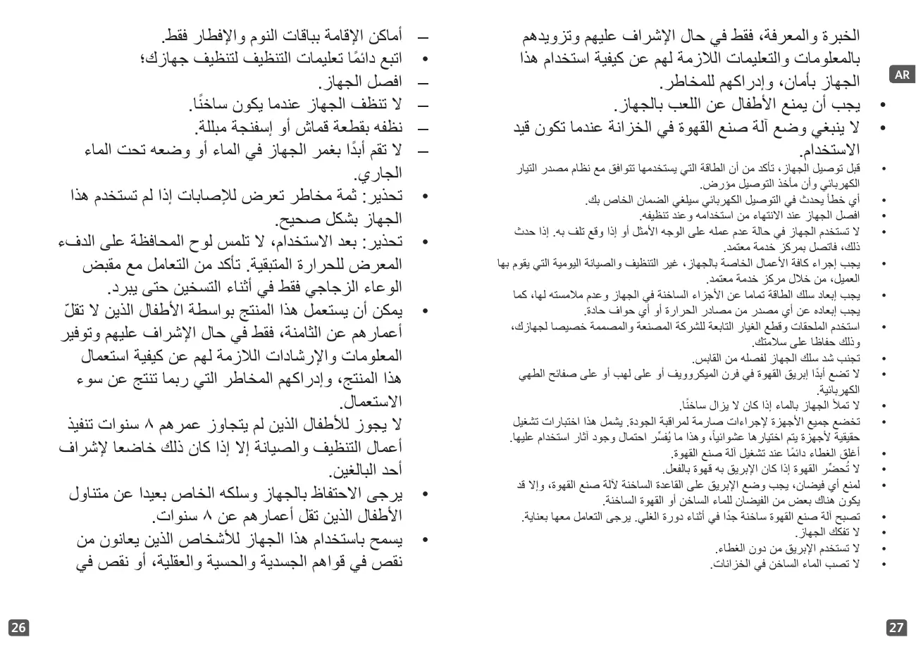 – les cuisines destinées au personnel des magasins, bureaux et autres environnements de travail ; – les fermes ; – les clients des hôtels, motels et autres lieux à caractère résidentiel ; – les environnements de type chambres d'hôtes. • Toujours suivre les instructions de nettoyage pour nettoyer votre appareil : – Débranchez l’appareil. – Ne nettoyez pas l'appareil s'il est encore chaud. – Rincez avec un chiffon ou une éponge humide. – N'immergez jamais l'appareil dans l'eau et ne le placez jamais sous l'eau courante. • AVERTISSEMENT : risques de blessures en cas de mauvaise utilisation de l'appareil. • AVERTISSEMENT : après l'utilisation, ne touchez pas la plaque de maintien au chaud, soumise à une chaleur résiduelle. Veillez à ne toucher que la poignée de la verseuse en verre 16