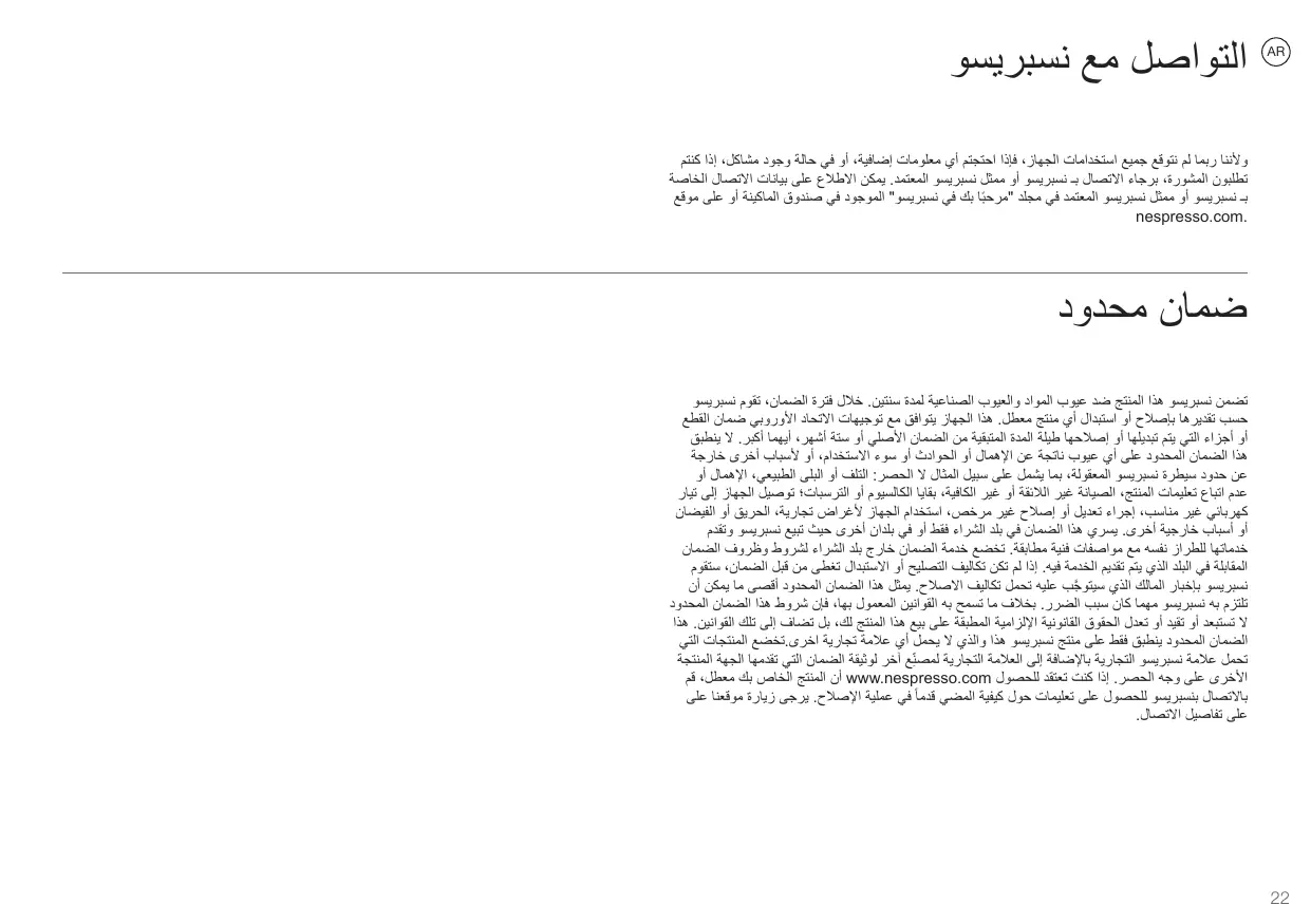 échangés et les pièces réparées seront garantis uniquement pendant la durée restante de la garantie originale ou durant six mois, l’échéance la plus lointaine faisant foi. Cette garantie limitée ne s’applique pas à tout défaut résultant d’une négligence, d’un accident, d’une utilisation inadaptée ou de toute autre raison hors du contrôle raisonnable de Nespresso, y compris mais sans s’y limiter : l’usure normale, la négligence ou le non-respect du mode d’emploi du produit, l’entretien inadapté ou inadéquat, les dépôts calcaires ou le détartrage, le branchement à une sortie électrique inadaptée, la modification ou la réparation non autorisée du produit, l’utilisation à des fins commerciales, les dommages causés par le feu, la foudre, les inondations ou toute autre cause extérieure. Cette garantie n’est valable que dans le pays où l’appareil a été acheté et dans les pays où Nespresso vend et assure l’entretien du même modèle avec des caractéristiques techniques identiques. Le service de garantie hors du pays d’achat se limite aux conditions de la garantie correspondante dans le pays où l’entretien est effectué. Si le coût des réparations ou de remplacement n’est pas couvert par cette garantie, Nespresso informera le propriétaire qui devra honorer ces frais. Cette garantie limitée constituera l’intégralité de la responsabilité de Nespresso, quelque soit la cause. Les conditions de la présente garantie limitée s’ajoutent aux droits statutaires obligatoires applicables à la vente du produit et ne les excluent, ni ne les restreignent ou modifient en rien, sauf dans les limites autorisées par la loi. La garantie limitée ne s’applique qu’à ce produit de marque exclusive Nespresso. Les produits de marque Nespresso et d’autres fabricants sont régis par la garantie fournie par l’autre fabricant exclusivement. Si vous pensez que votre produit est défectueux, veuillez contacter Nespresso pour obtenir des renseignements concernant la marche à suivre pour le faire réparer. Veuillez consulter notre site Internet au www.nespresso.com pour obtenir les coordonnées de contact.