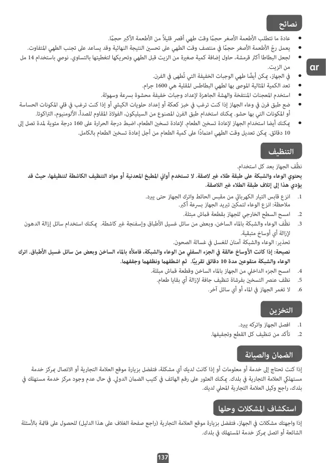 1. Stellen Sie das Gerät auf eine ebene, feste und hitzebeständige Arbeitsfläche geschützt vor Wasserspritzern auf. Anmerkung: Die unten aufgeführten Garzeiten sind nur eine Orientierungshilfe und können je nach Sorte und Menge der verwendeten Kartoffeln variieren. Bei anderen Lebensmitteln können die Größe, Form und Marke das Ergebnis beeinflussen. Sie müssen daher eventuell die Garzeit leicht anpassen. 1. Ziehen Sie den Stecker des Geräts und lassen Sie das Gerät abkühlen. 2. Achten Sie darauf, dass alle Elemente sauber und trocken sind. • Druk op de om het bakproces met de gekozen temperatuur en tijd te starten. • Het bakproces start. De resterende baktijd wordt op het scherm weergegeven. 5. Overtollig olie van de ingrediënten wordt in de onderkant van de binnenpan opgevangen. 6. Voor bepaalde ingrediënten is het nodig om ze op de helft van de baktijd te schudden (zie de sectie “Kookgids”). Om de ingrediënten te schudden, trek de binnenpan via de handgreep uit het apparaat en schud de binnenpan. Schuif vervolgens de binnenpan terug in het apparaat en de bereiding start automatisch opnieuw. Als de kookmodus voor friet is ingeschakeld, knippert dit pictogram halverwege het programma. Dit geeft aan dat de friet moet worden geschud voor gelijkmatige bereiding. 7. Als de baktijd is verstreken, hoort u een geluidssignaal en wordt het apparaat uitgeschakeld. Trek de binnenpan uit het apparaat en plaats het op een warmtebestendig oppervlak. 8. Controleer of de ingrediënten gaar zijn. Eenmaal de ingrediënten nog niet gaar zijn, schuif de binnenpan opnieuw in het apparaat en stel de timer nog enkele minuten in. 9. Eenmaal de ingrediënten gaar zijn, haal de binnenpan uit het apparaat. Gebruik een tang om de ingrediënten uit de binnenpan te halen. Opgelet: Als u de binnenpan omdraait, kan er olie, die zich op de bodem van de binnenpan bevindt, op de ingrediënten druppelen en kan het rooster uit het apparaat vallen. De binnenpan, het rooster en de ingrediënten zijn na het frituren zeer warm. 10. Na het bereiden van ingrediënten, kan het apparaat onmiddellijk opnieuw gebruikt worden. 25 Indica la necesidad de agitar (remover) la comida. Se ilumina a mitad del cocinado para el programa de patatas fritas.